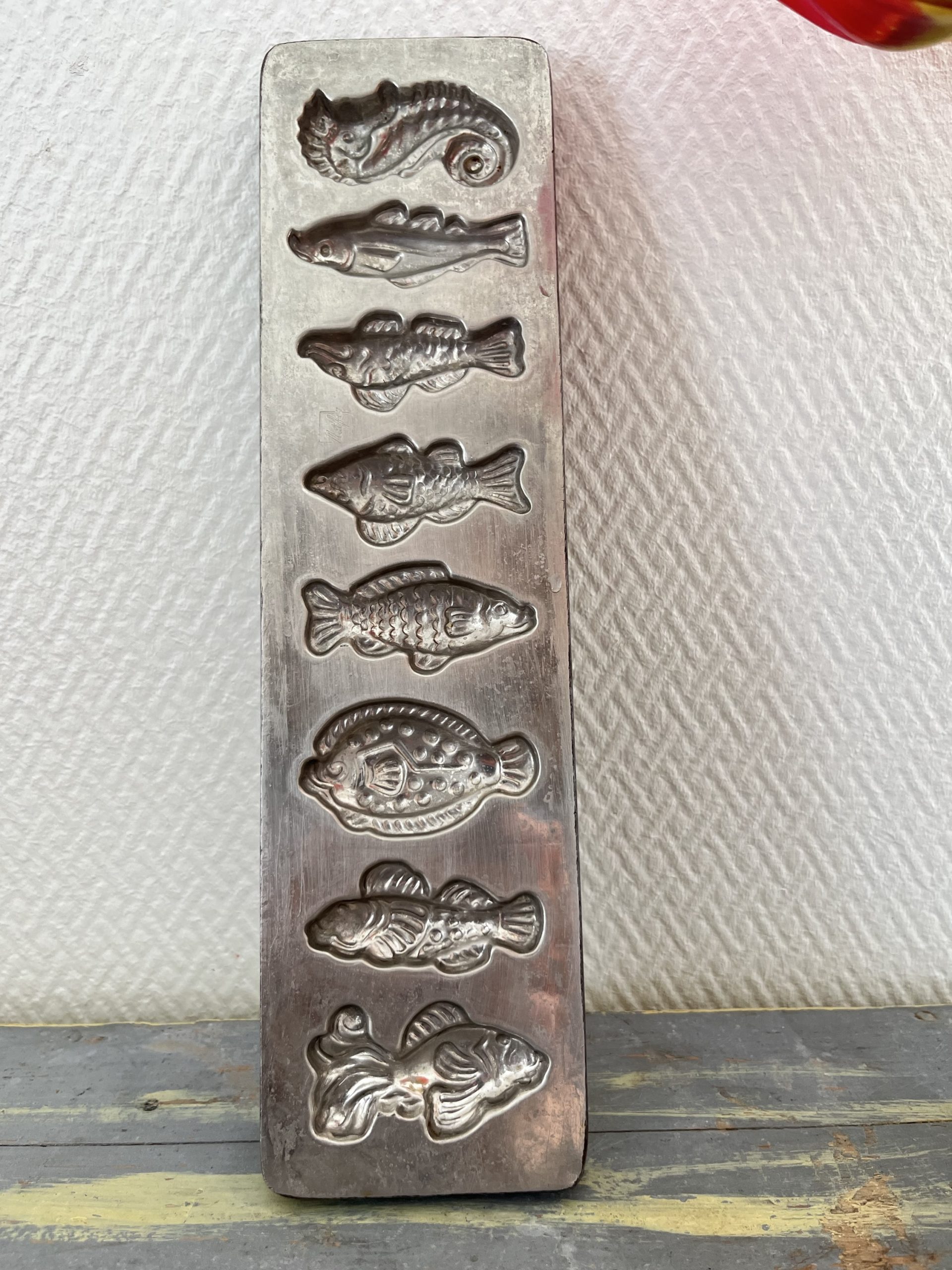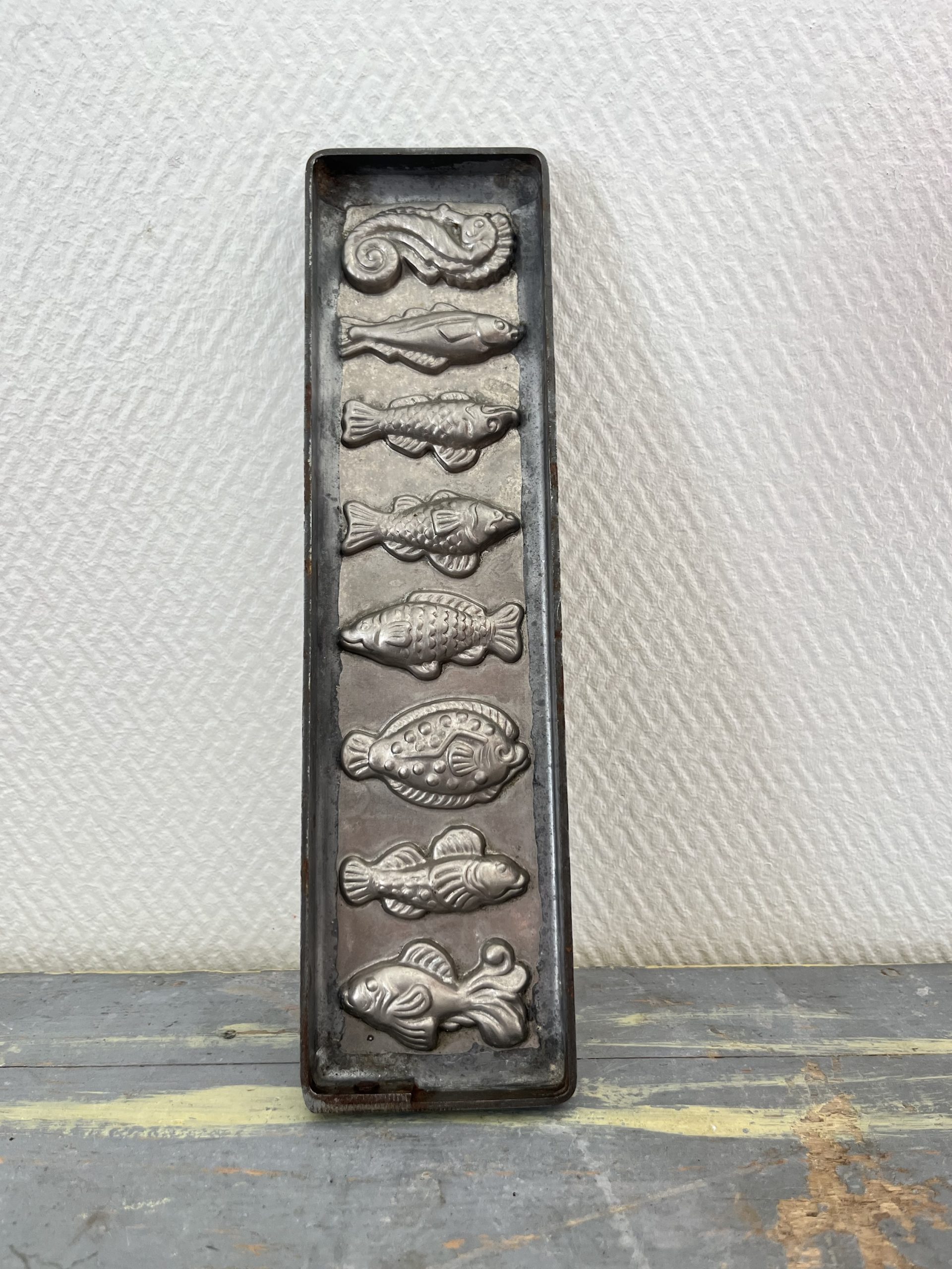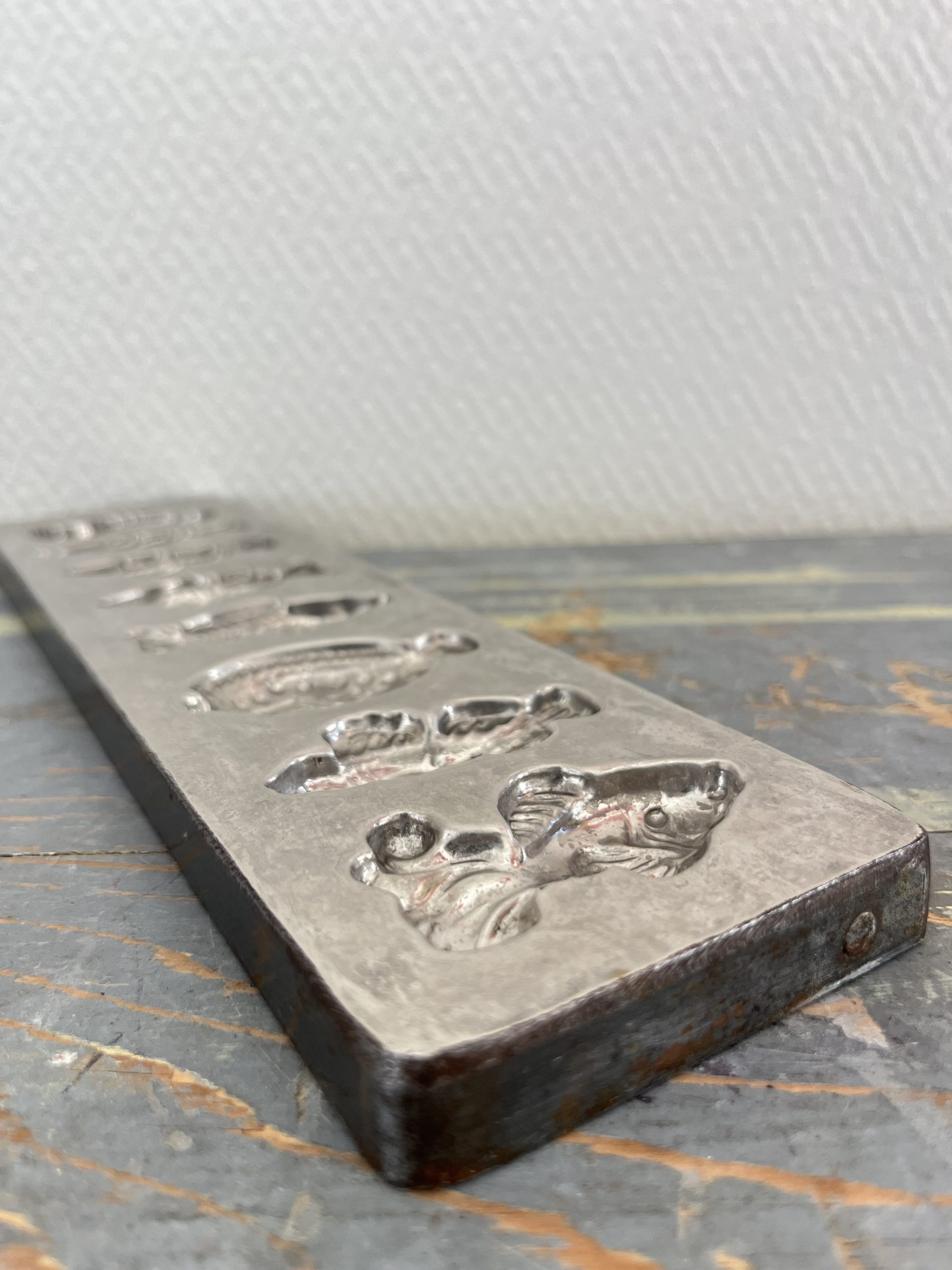 Années 50, en métal étamé, manufacture Letang et fils, très joli moule à fritures en chocolat, très bel état général.