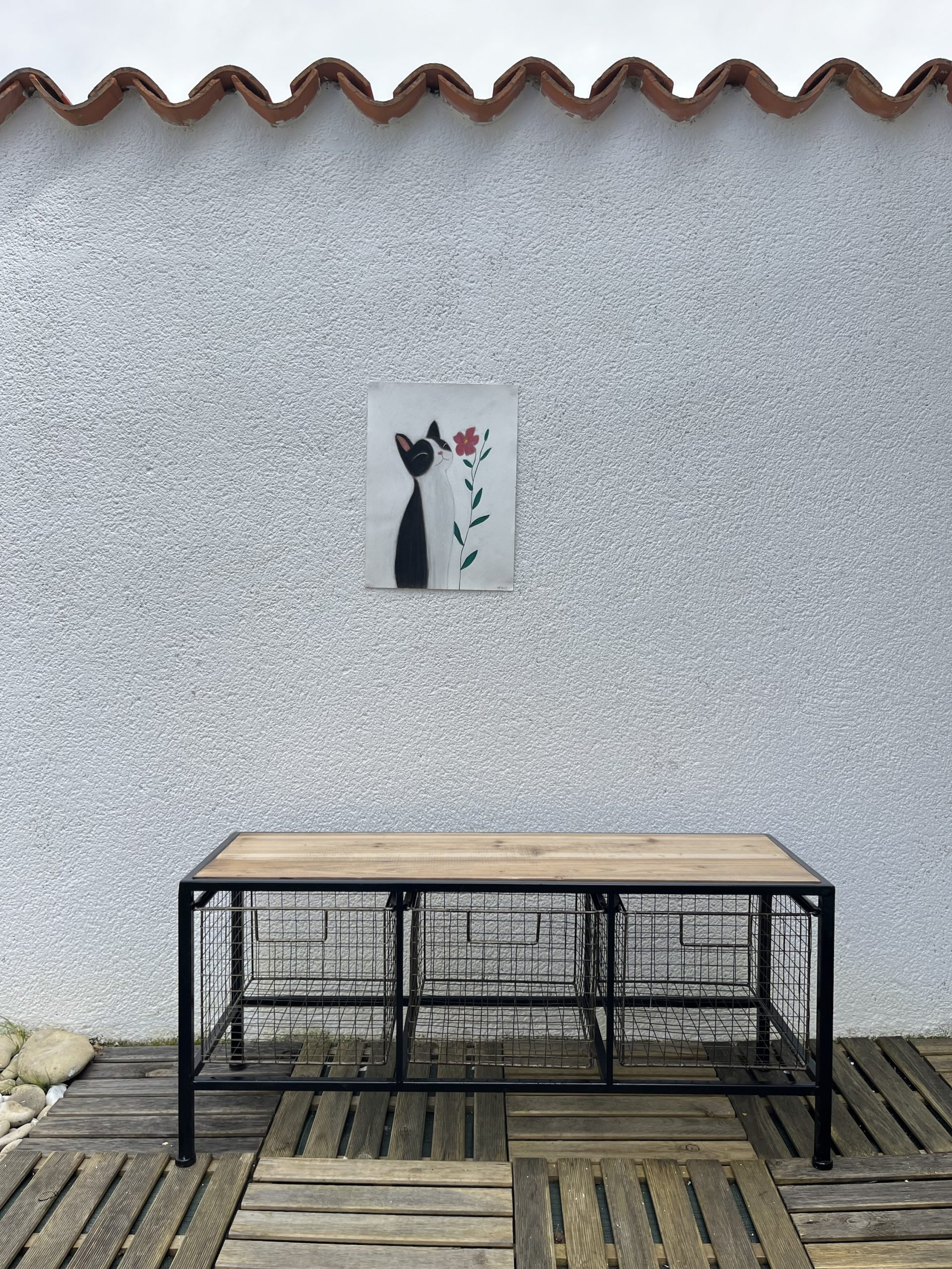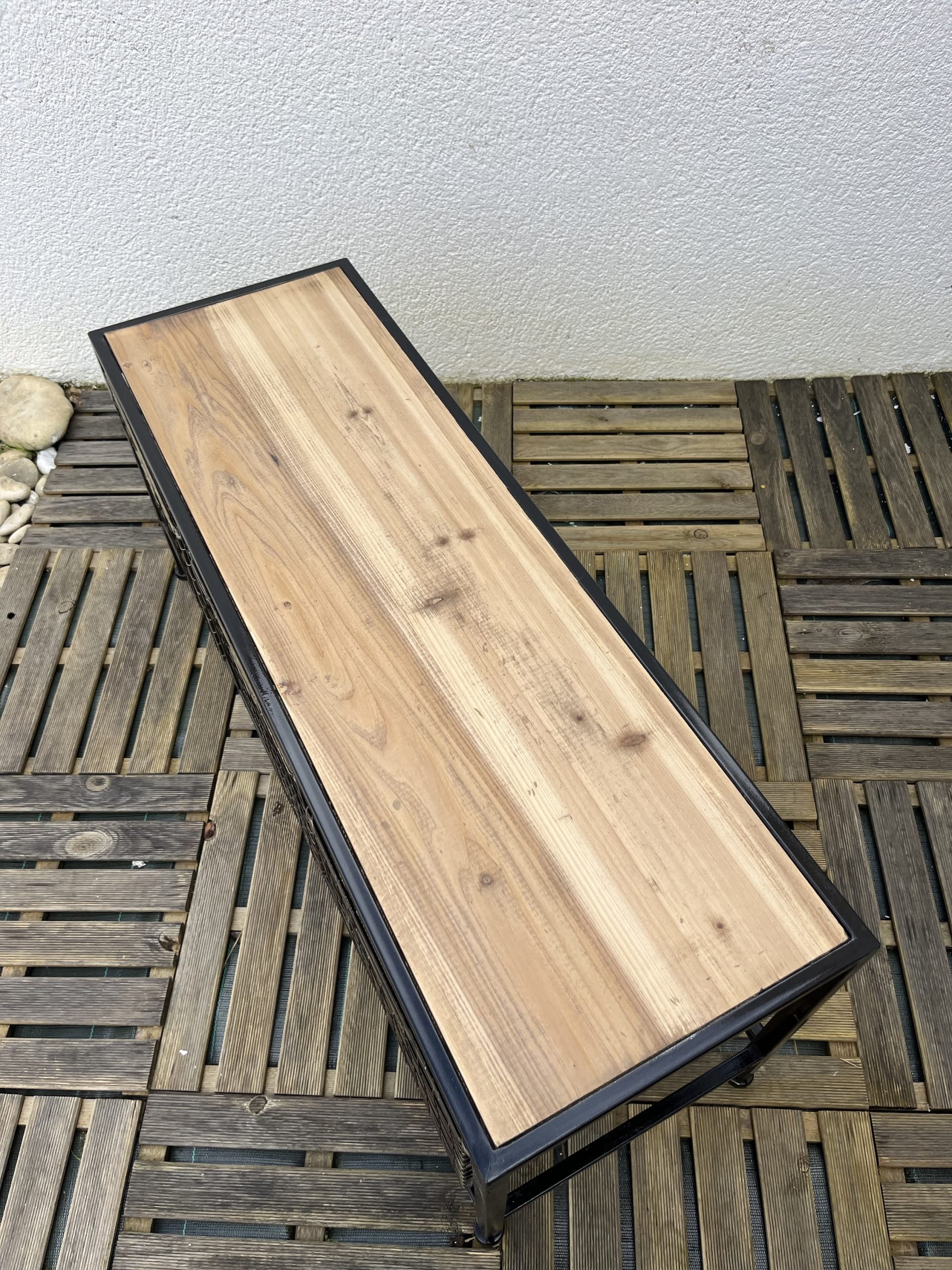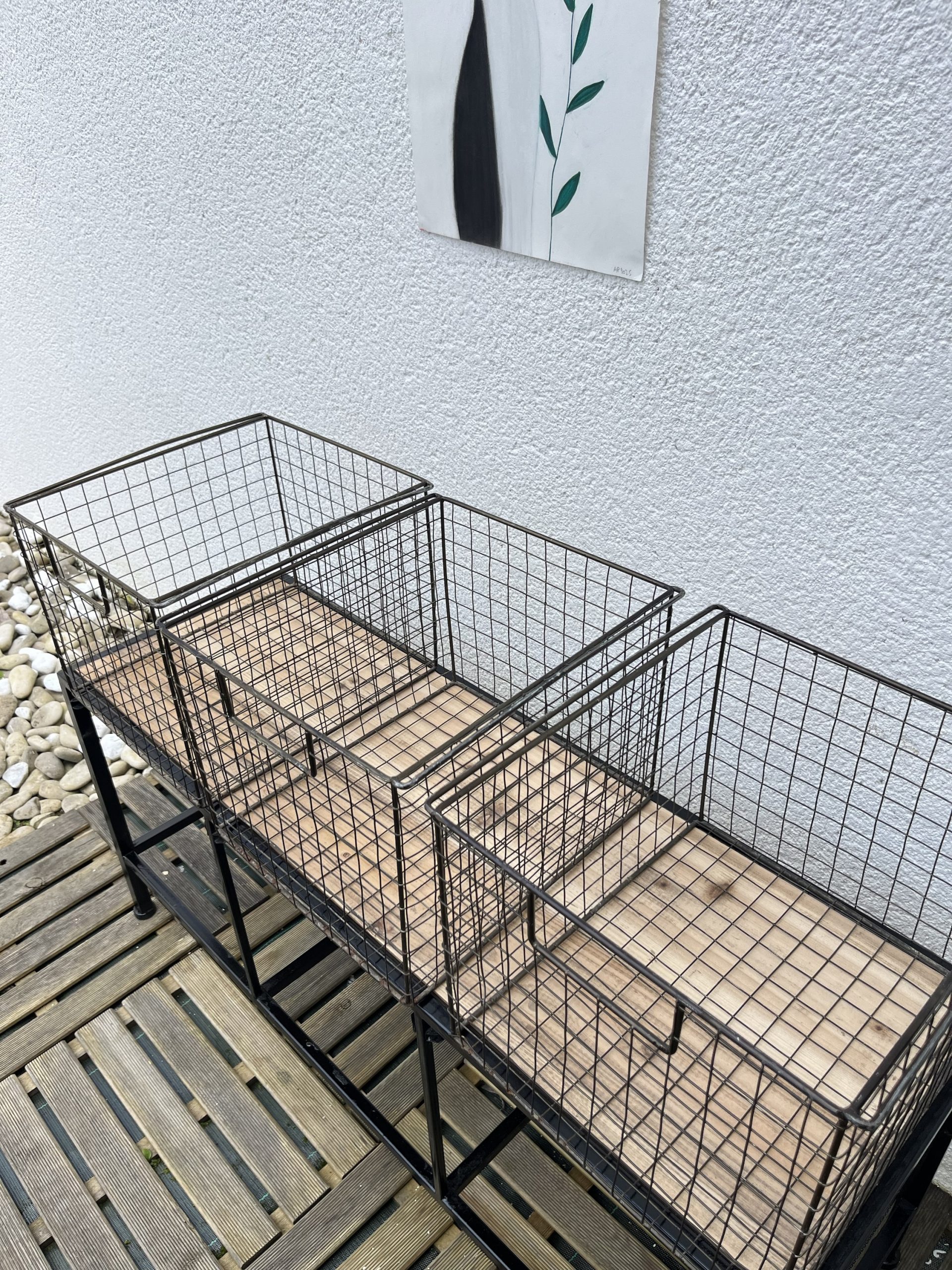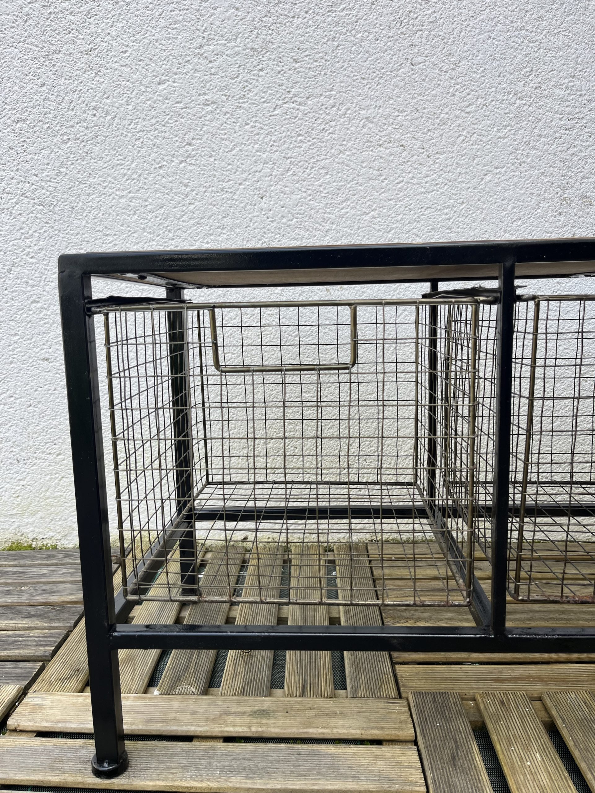 La structure est en métal noir, les casiers sont en métal couleur brute, le dessus est en bois.