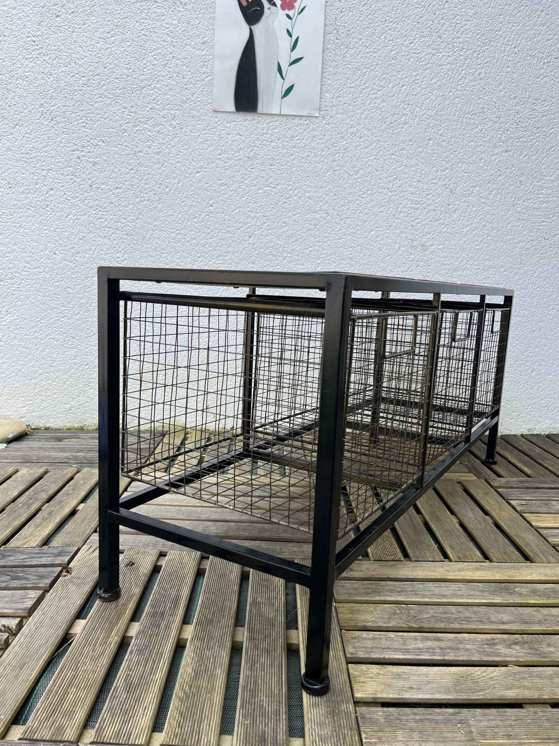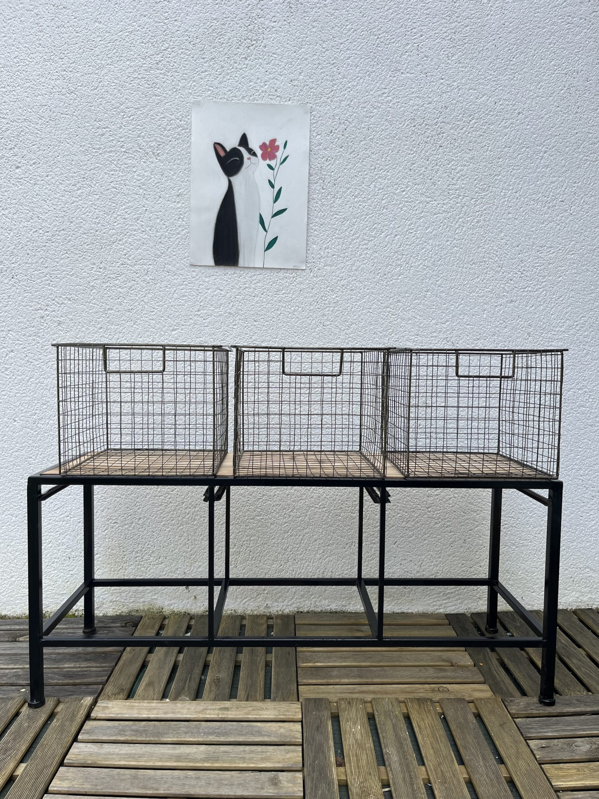 En métal et bois de sapin, trois casiers en métal grillagé.