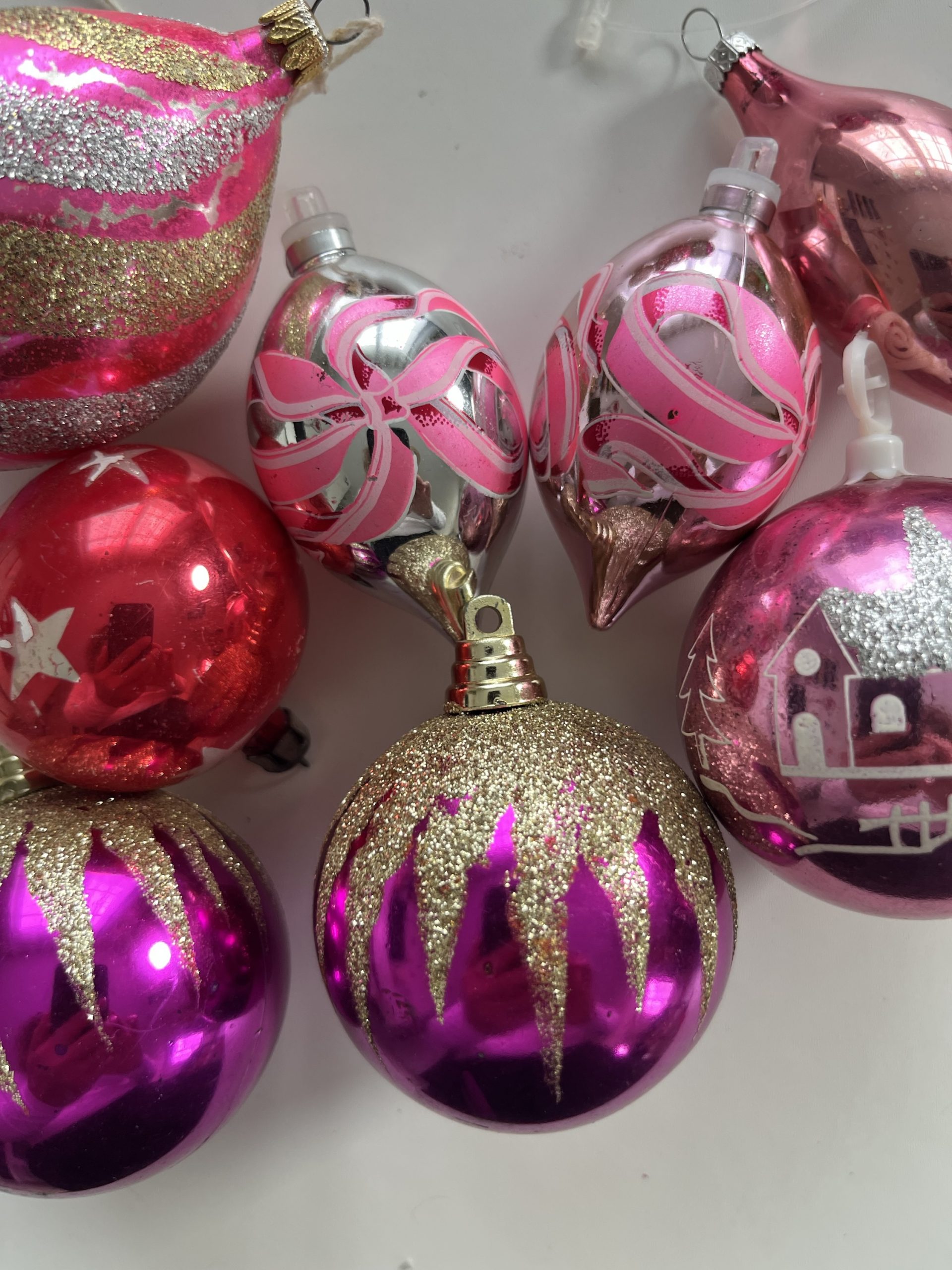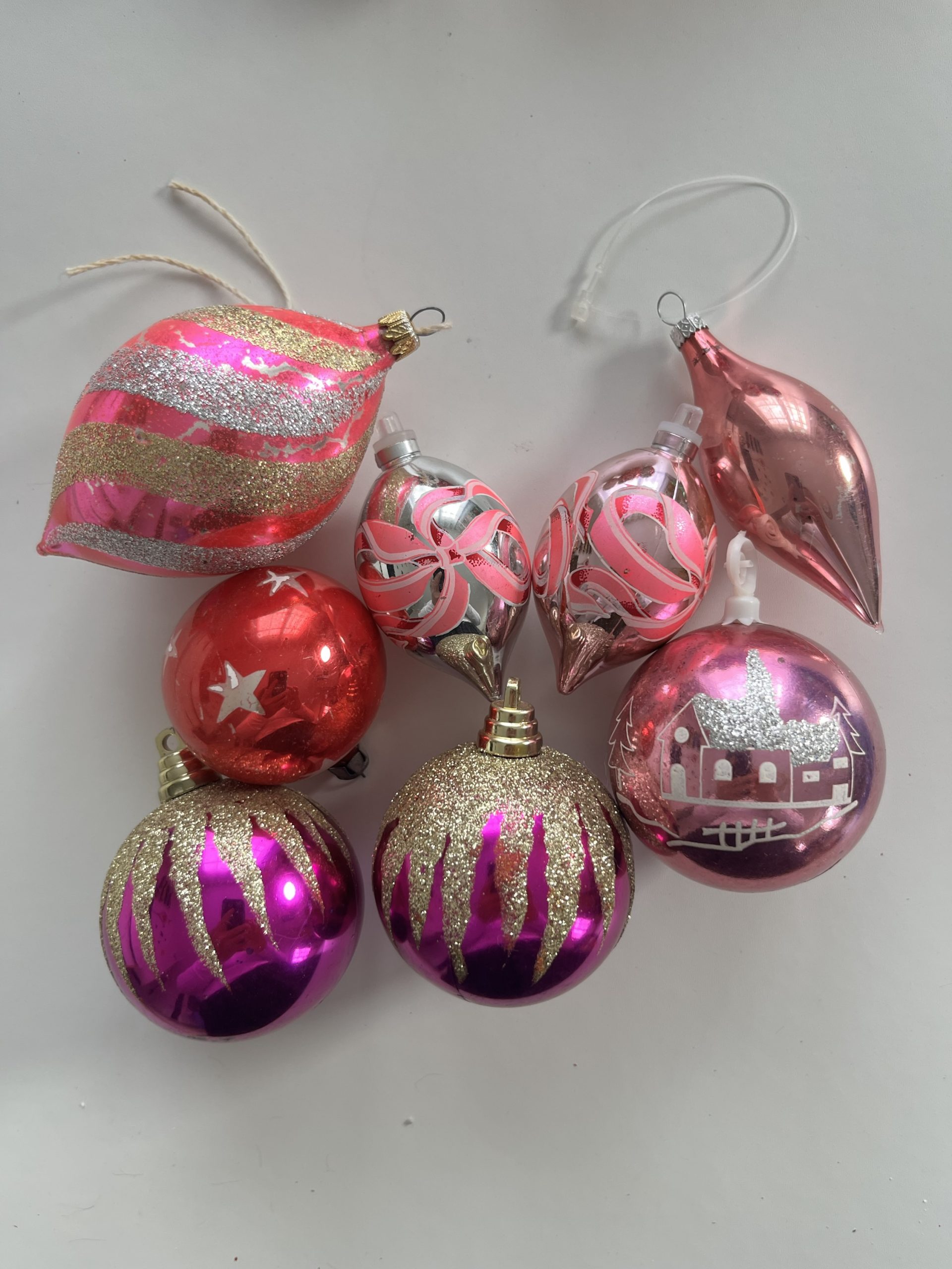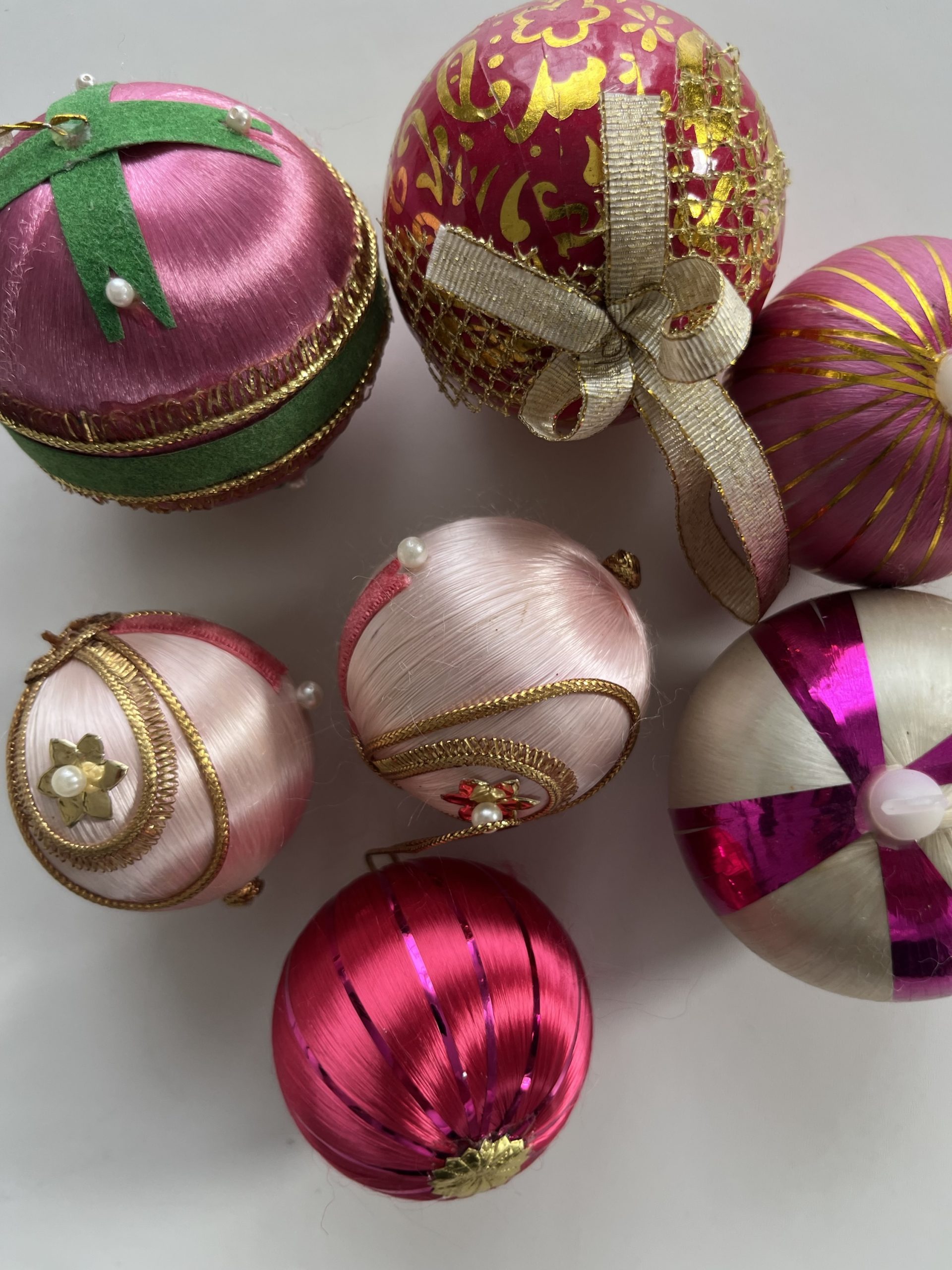 • Lot 7 boules de noël vintage, en fil de coton et file de soie, ensemble en très bon état.