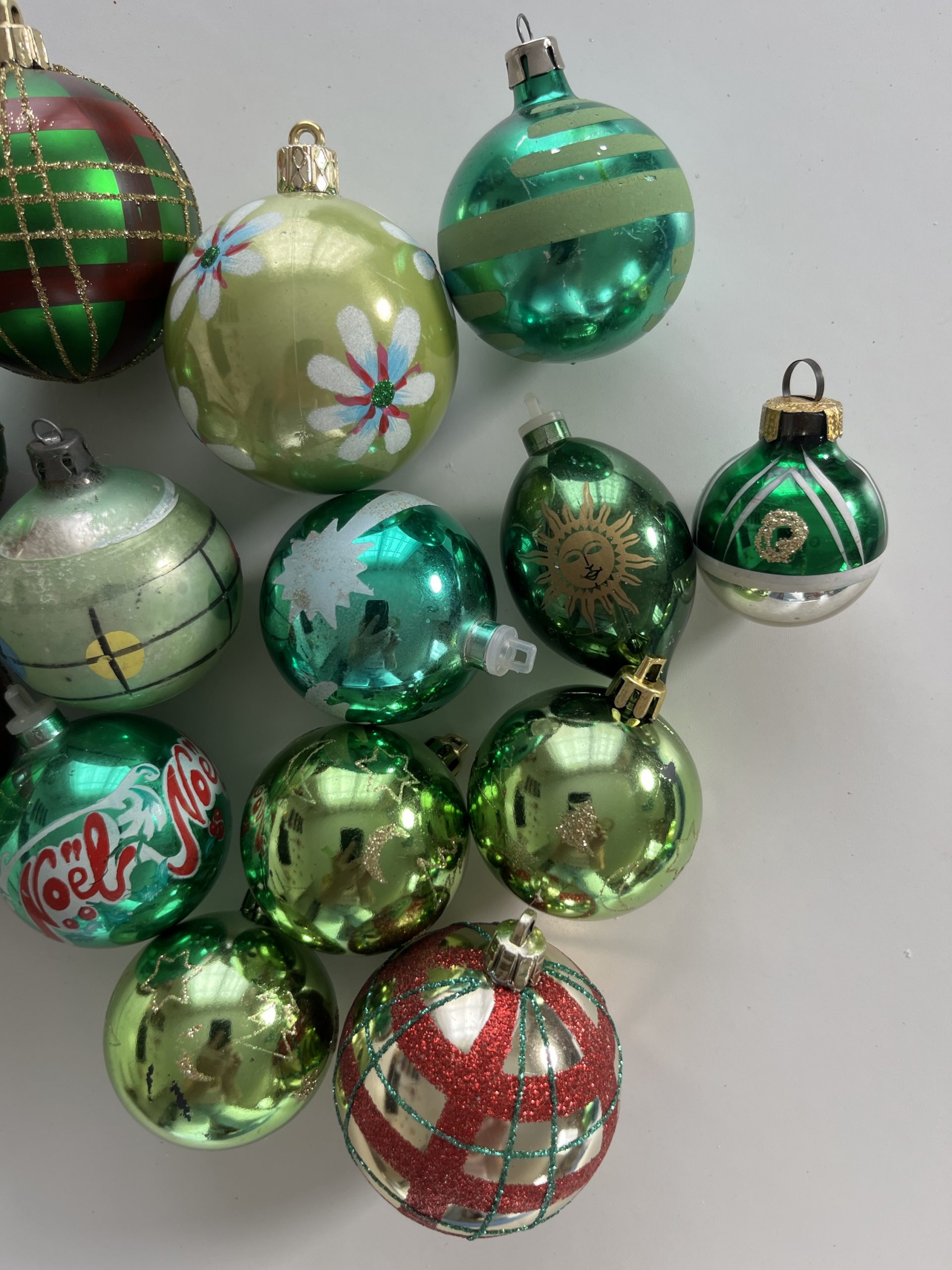 lot 14 boules de noël vintage, certaines sont en verre, certaines sont peintes à la main.
