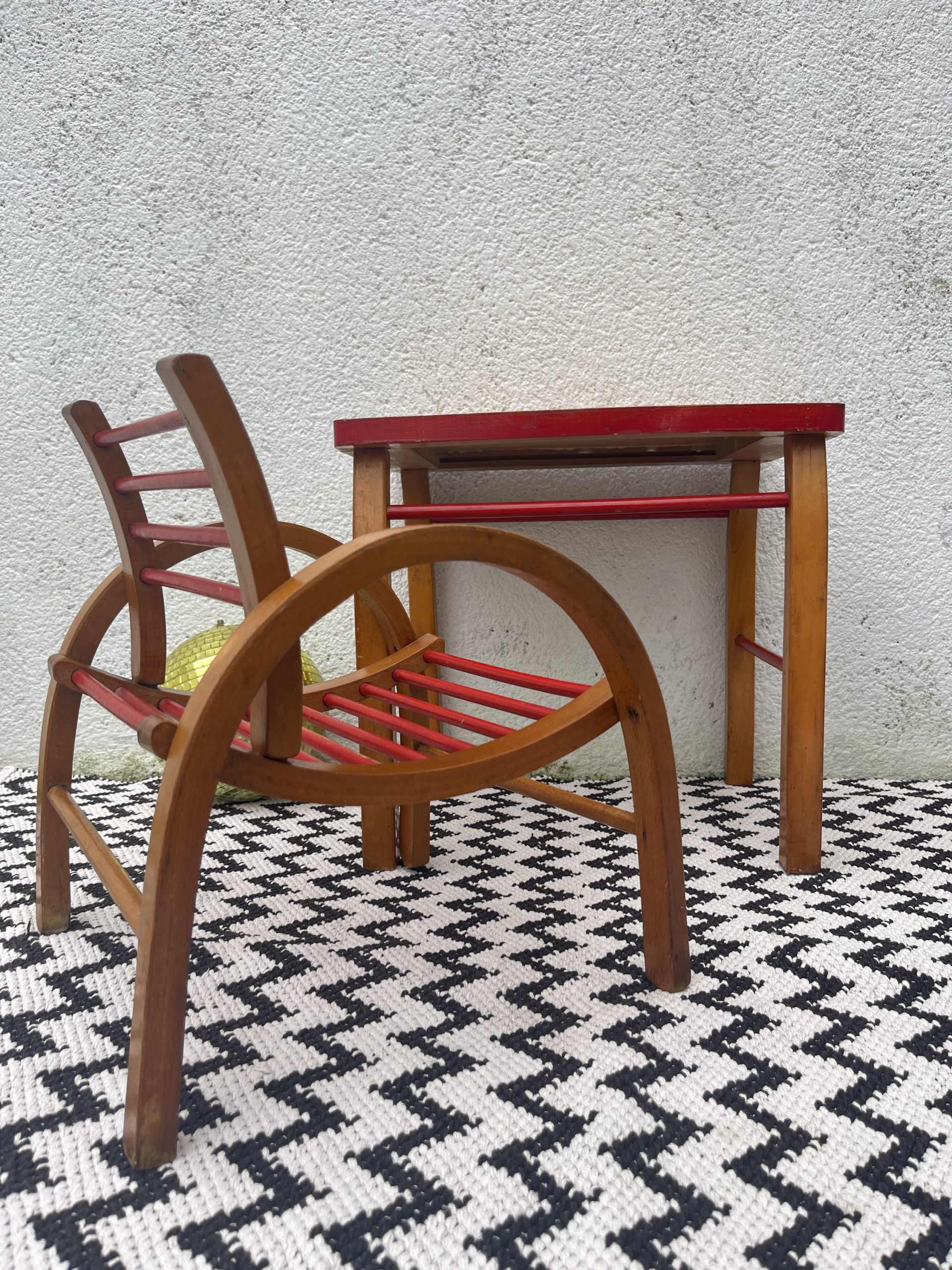 Années 70, fabrication Française, design Baumann ( voir photo catalogue), joli ensemble composé d’un bureau en bois de hêtre et son fauteuil assorti !