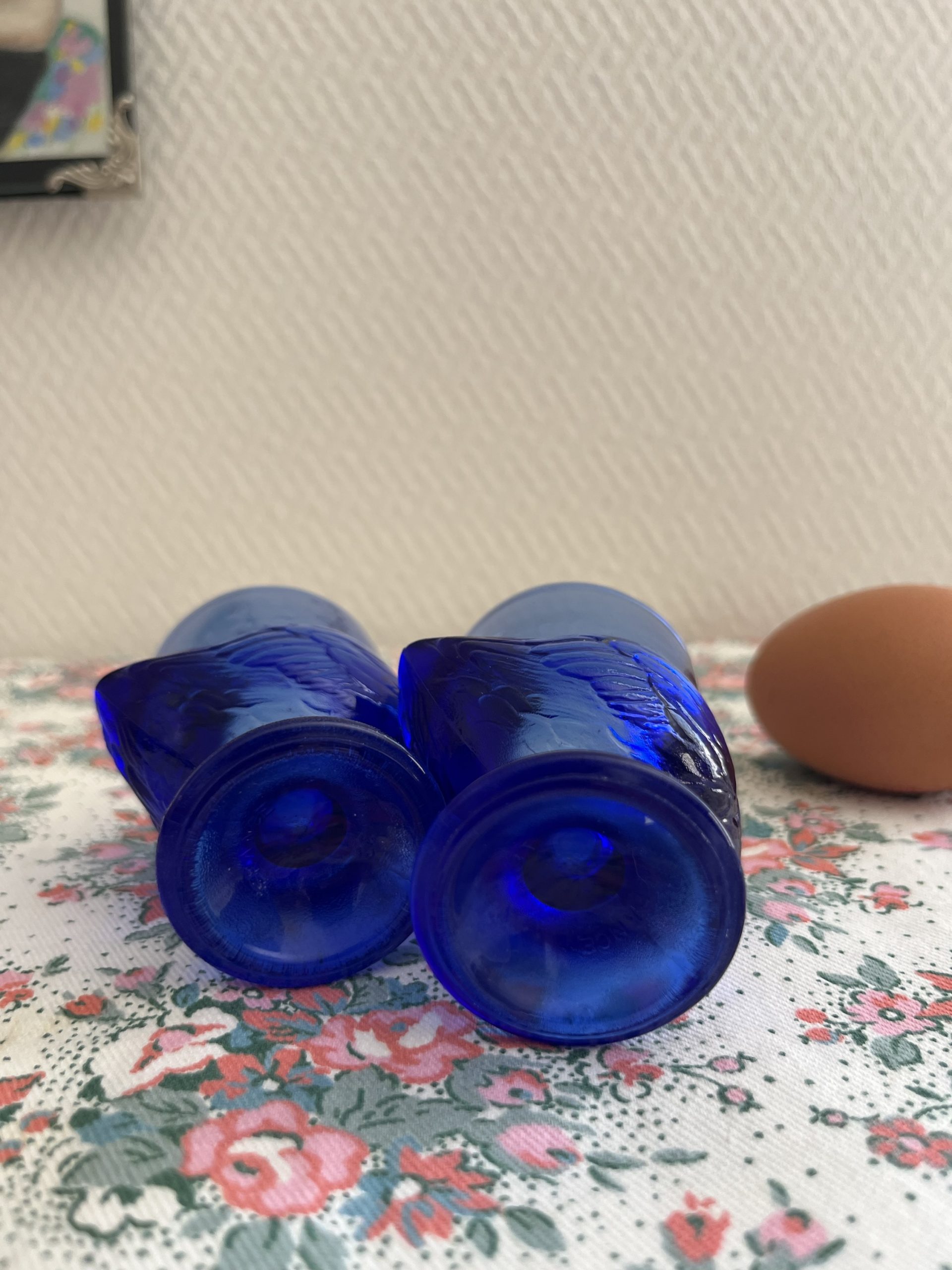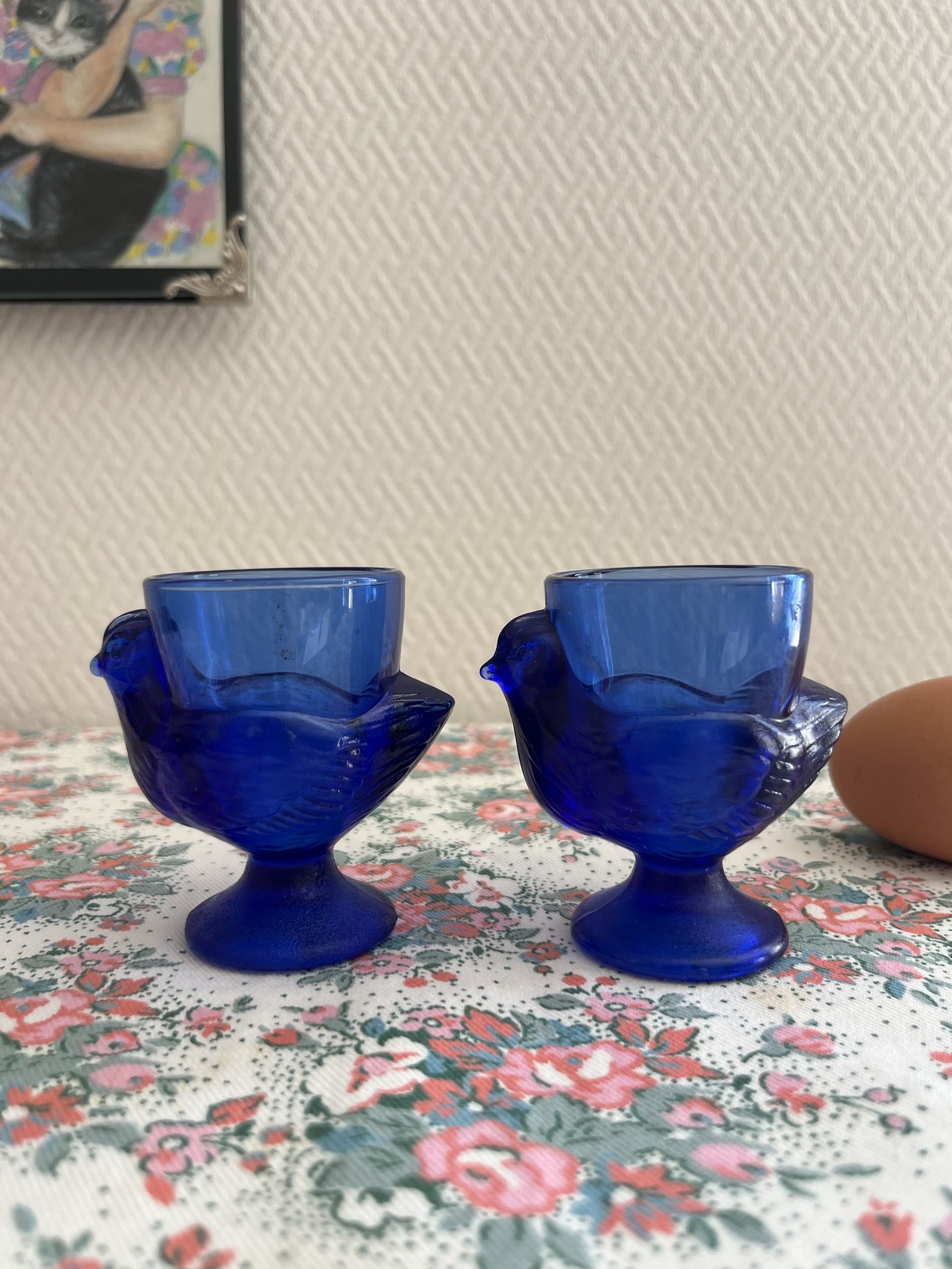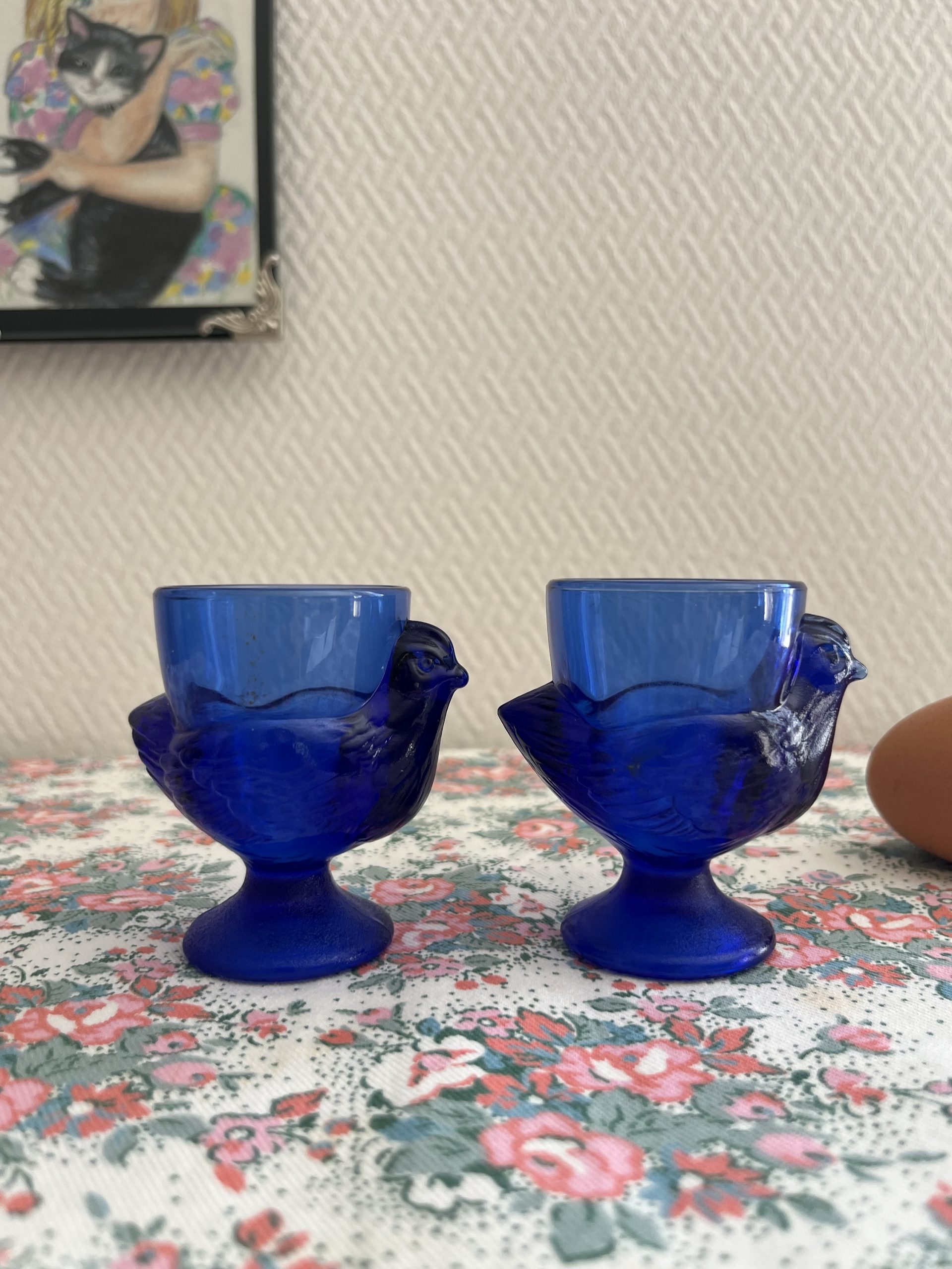 On craque pour ces coquetiers vintage en forme de poules en verre bleu made in france.