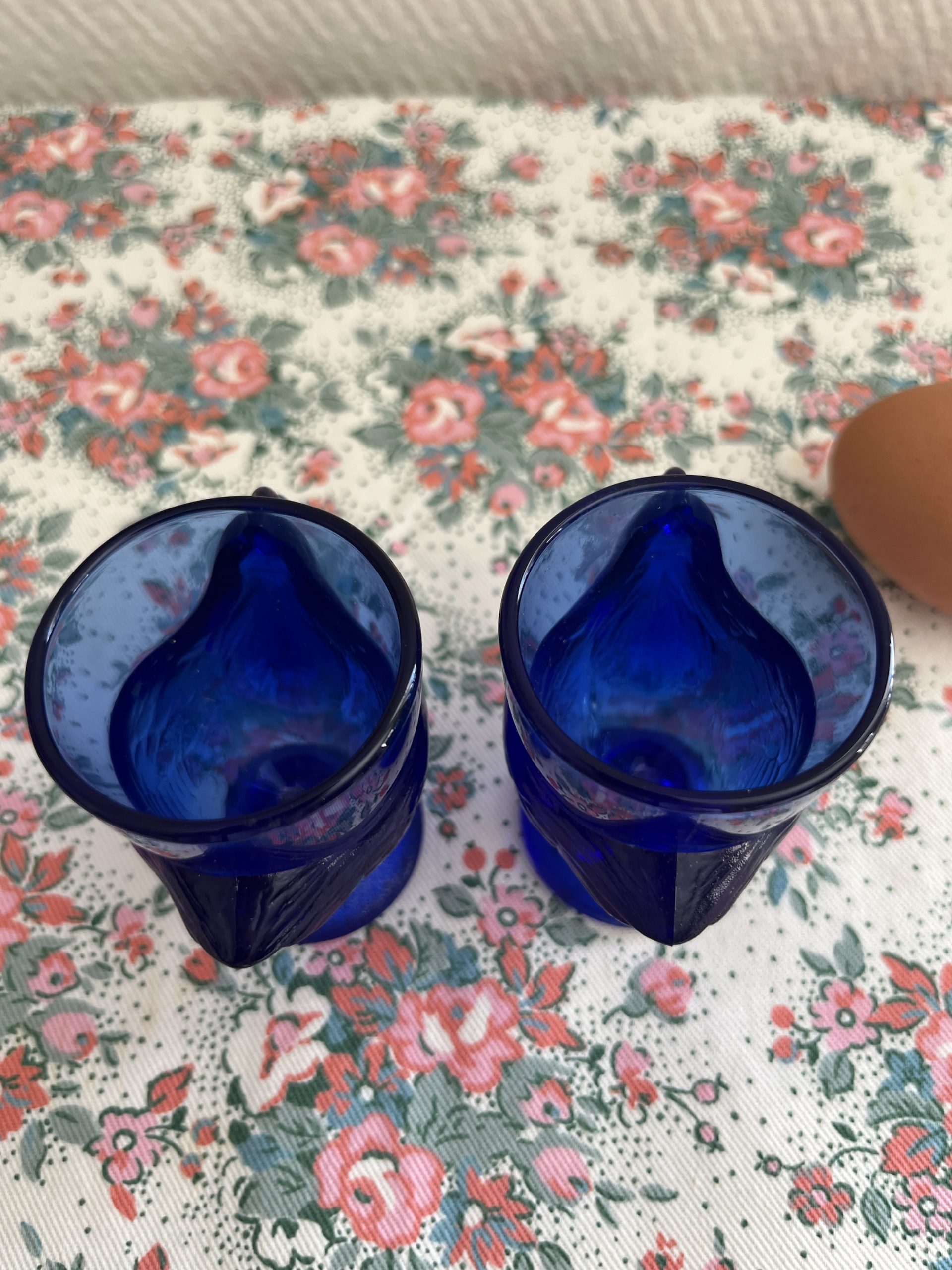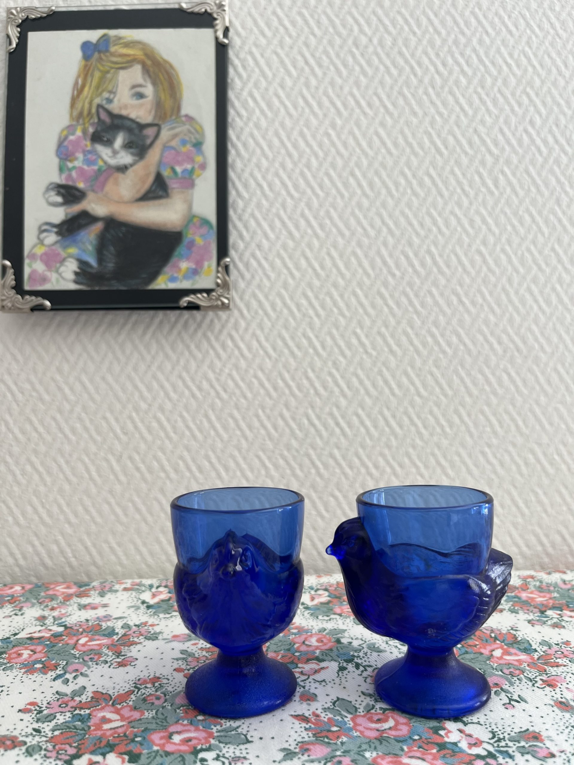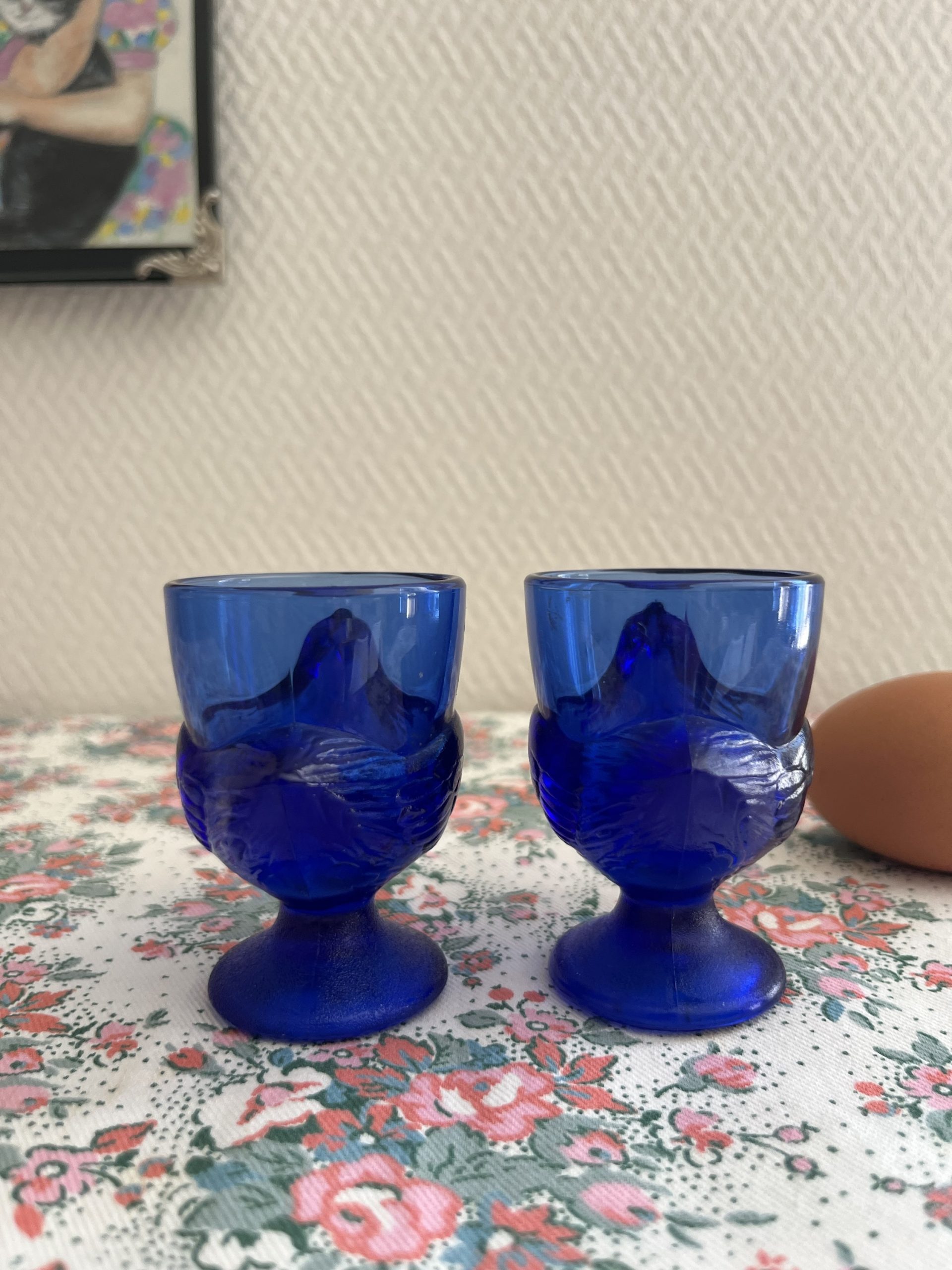 On craque pour ces coquetiers vintage en forme de poules en verre bleu made in france.