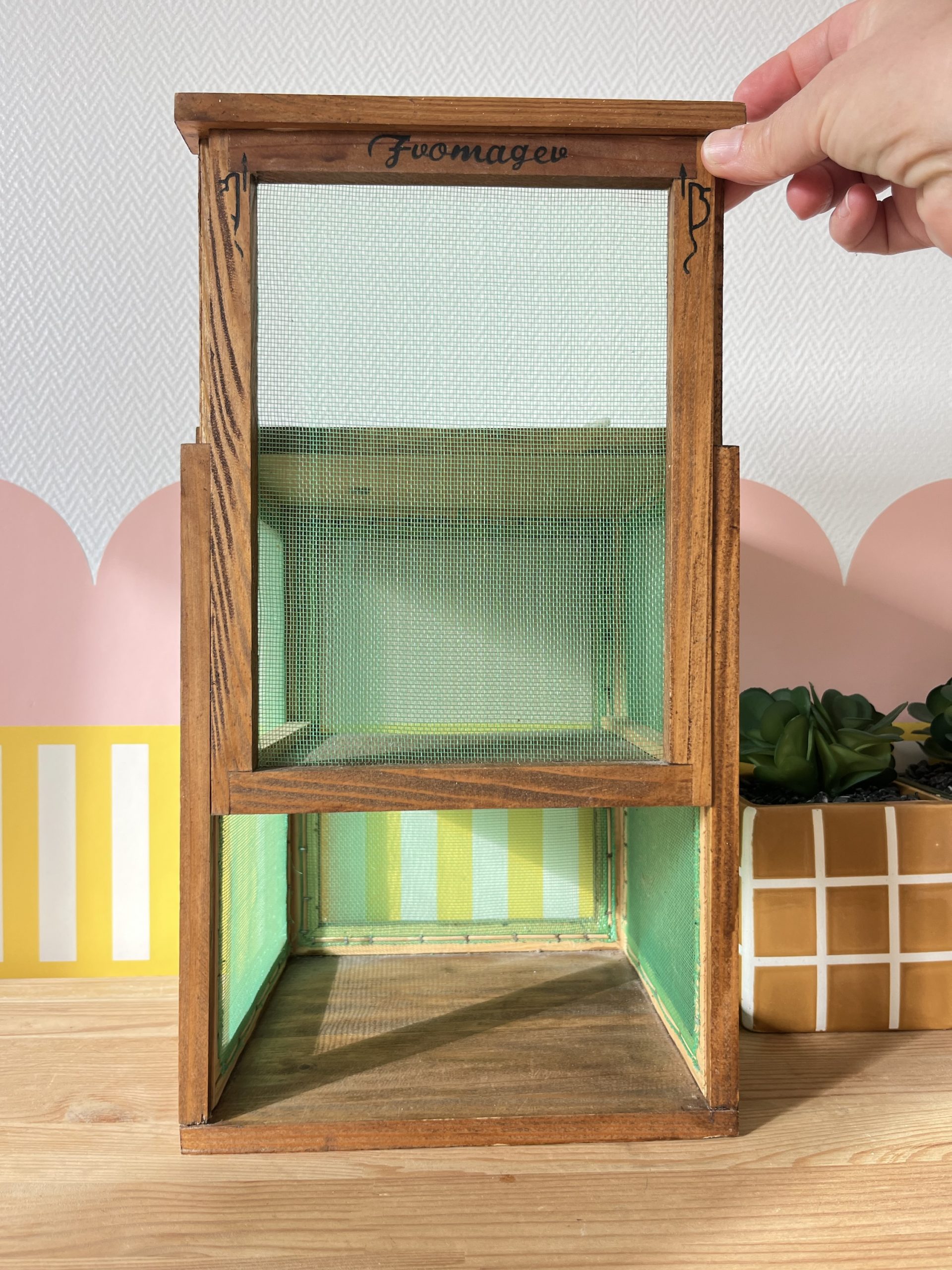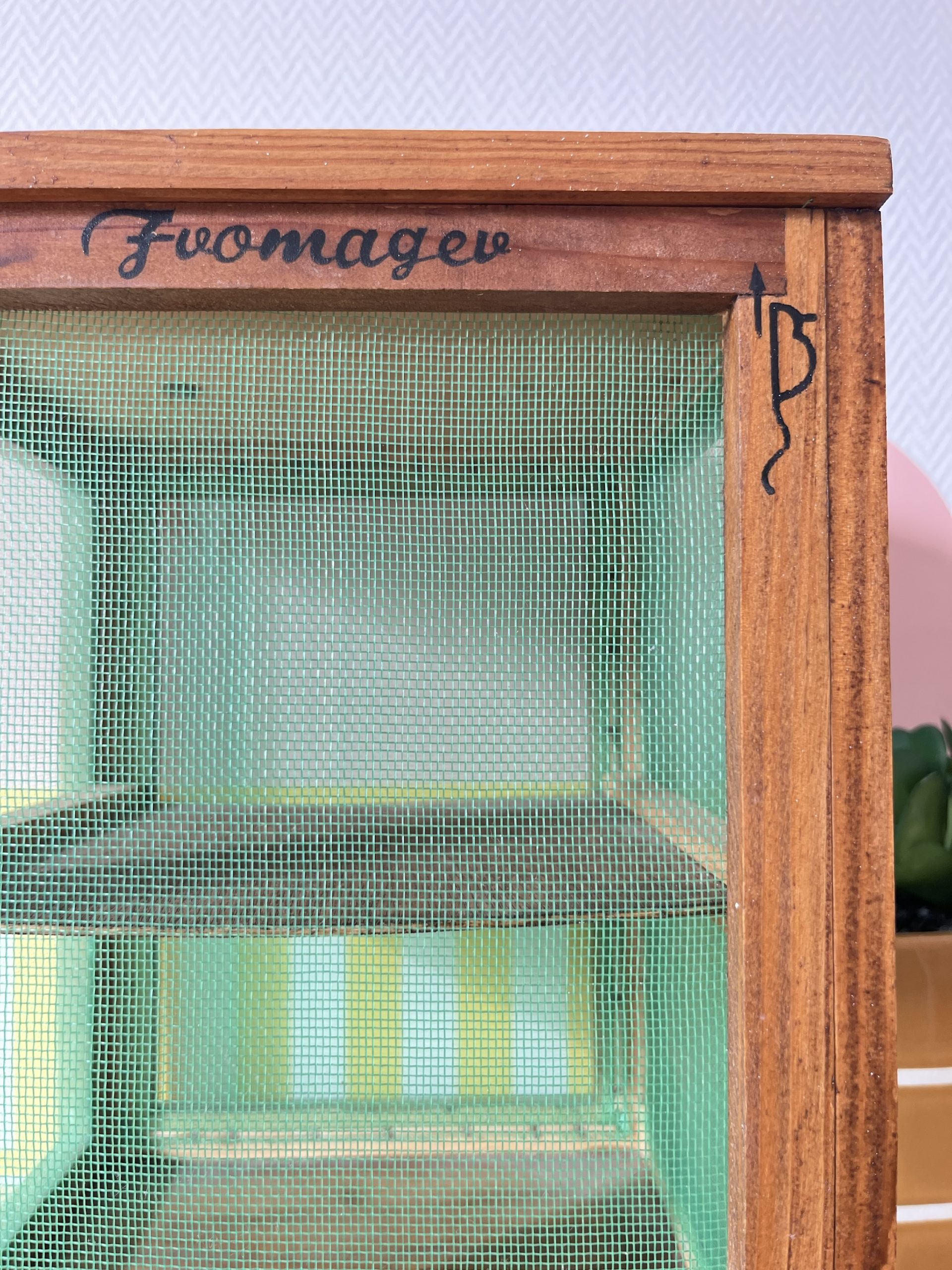 En bois, deux étagères, le bois est sain, s’ouvre sur le devant, porte coulissante par le haut, en parfait état, pour conserver le fromage mais aussi vos fruits et légumes.