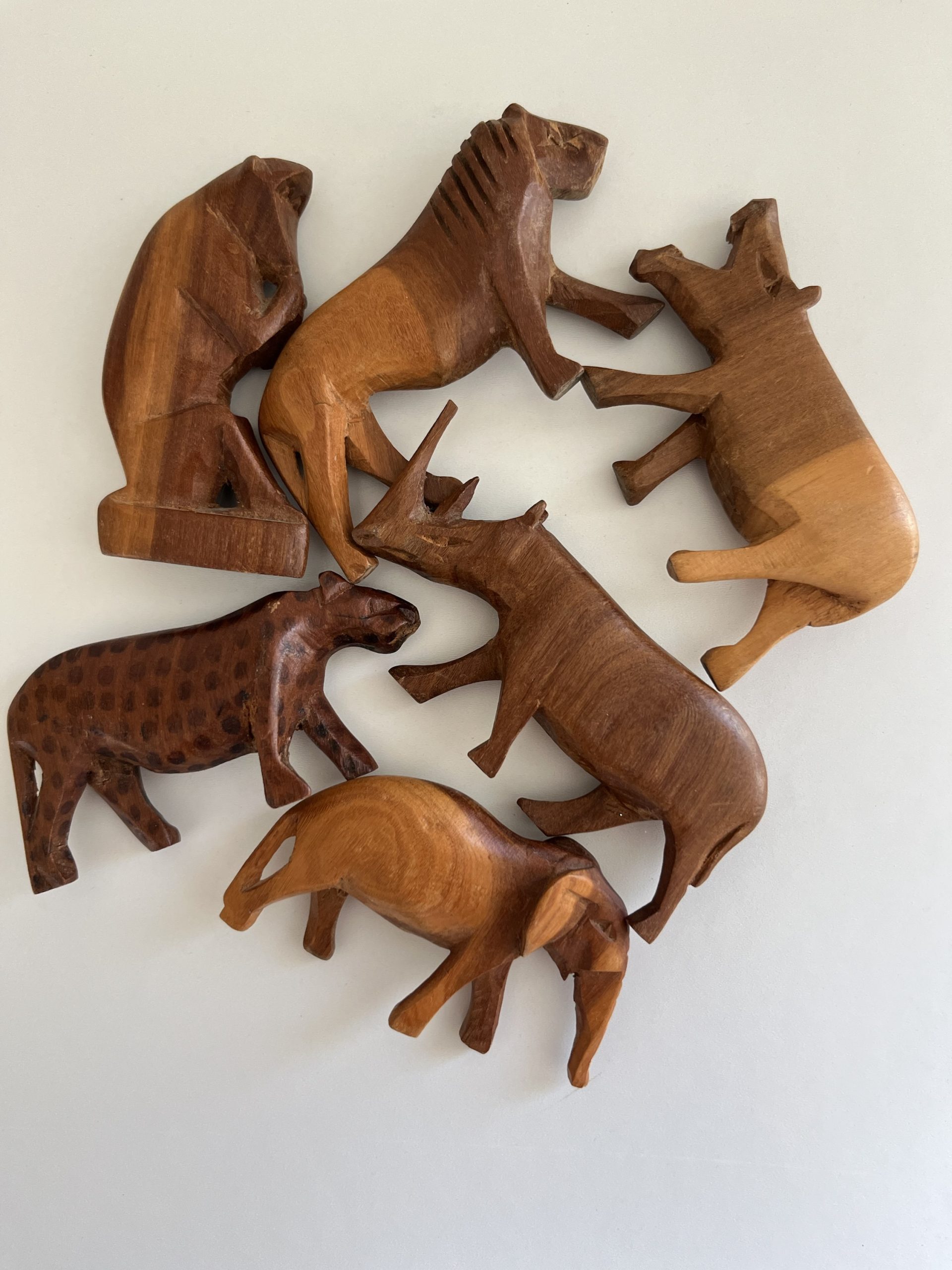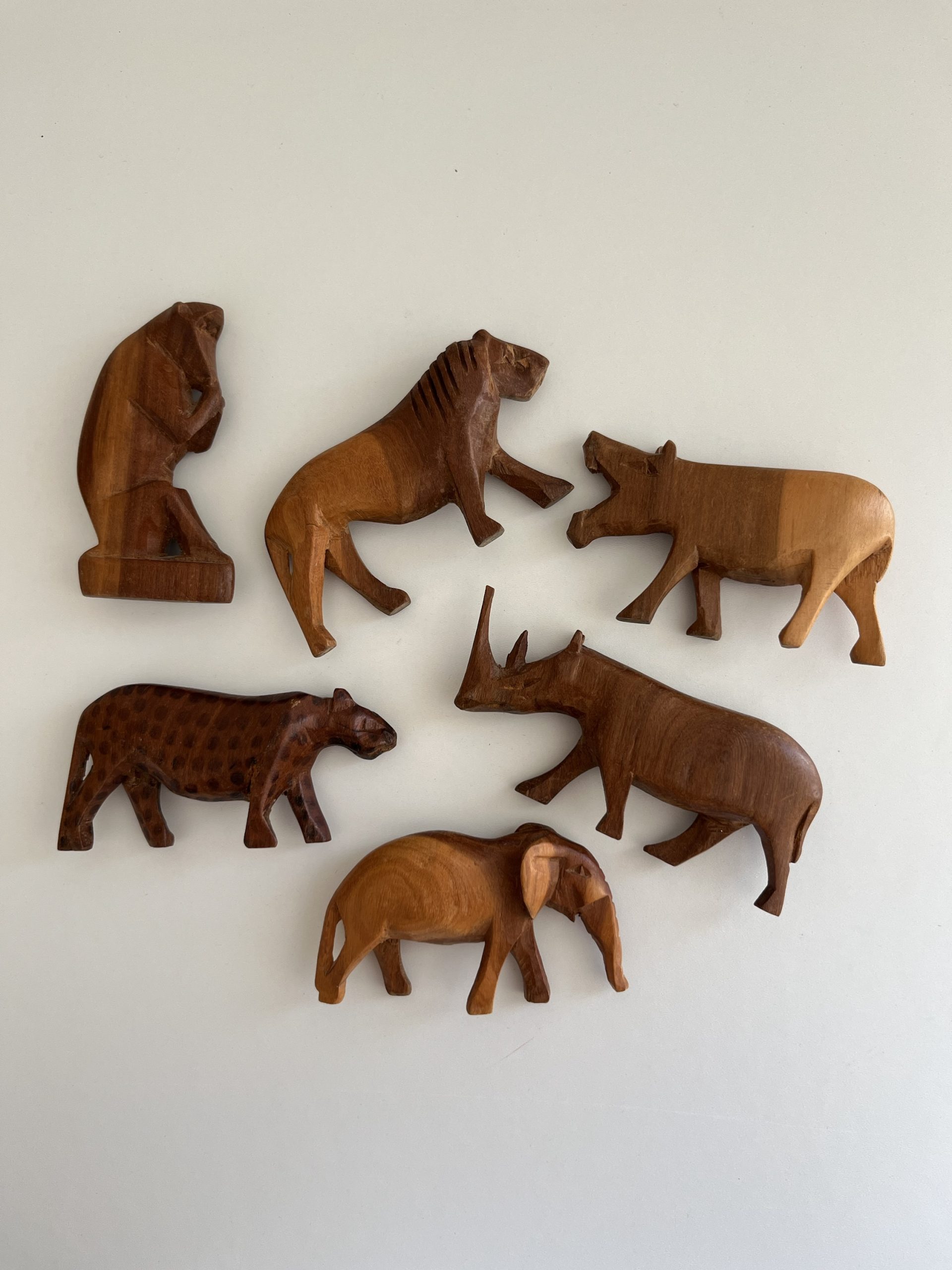 Fabrication artisanale, dans différentes essence de bois, très joli lot composé de 6 animaux : d’un lion, d’une panthère, d’un rhinocéros, un singe, un éléphant, un hippopotame.