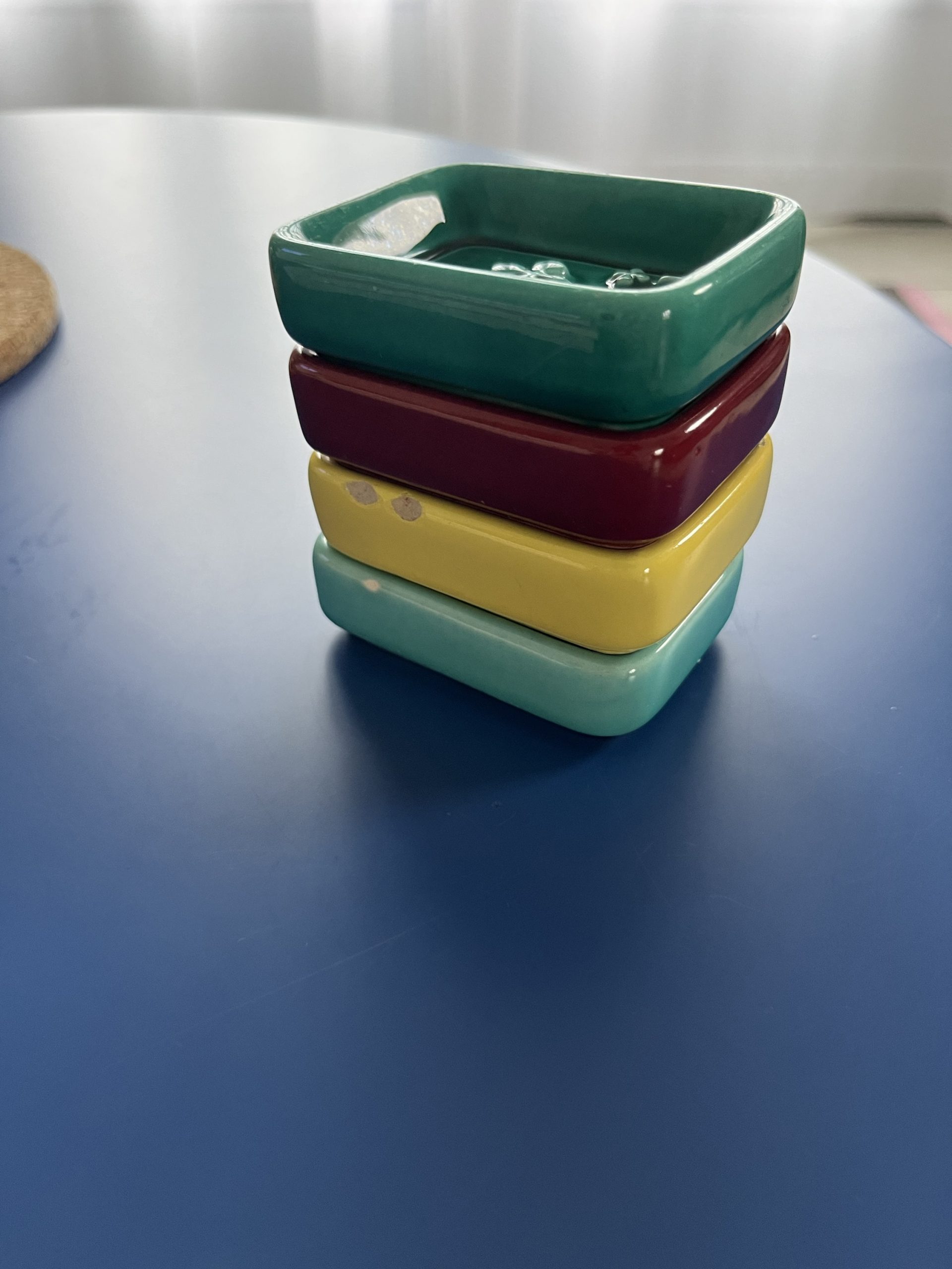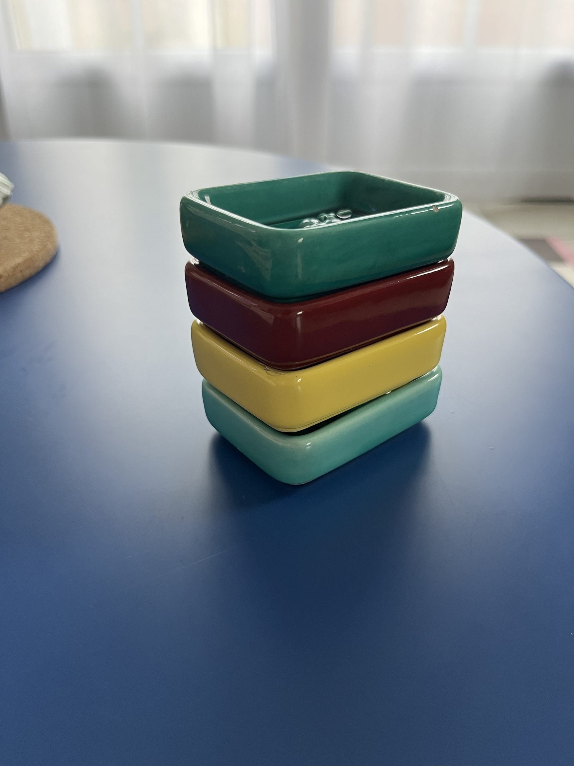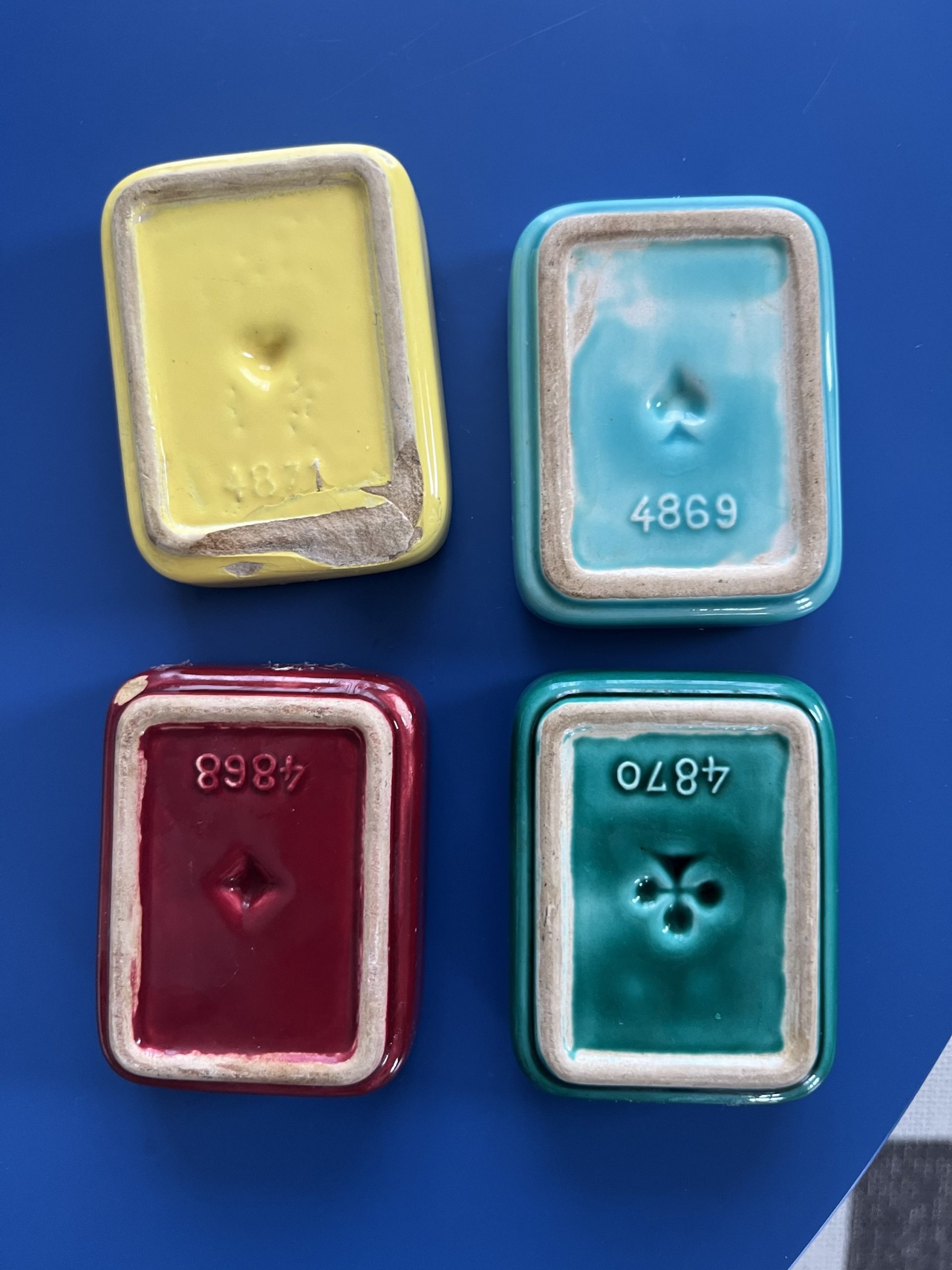Années 50/70, petits cendriers en forme de cartes à jouer, en céramique, au décor en relief de cœur, pic, trèfle et carreau, numéroté sur le dessous, aux jolies couleurs émaillées, à détourner en contenant pour condiments, apéritifs ou en déco …