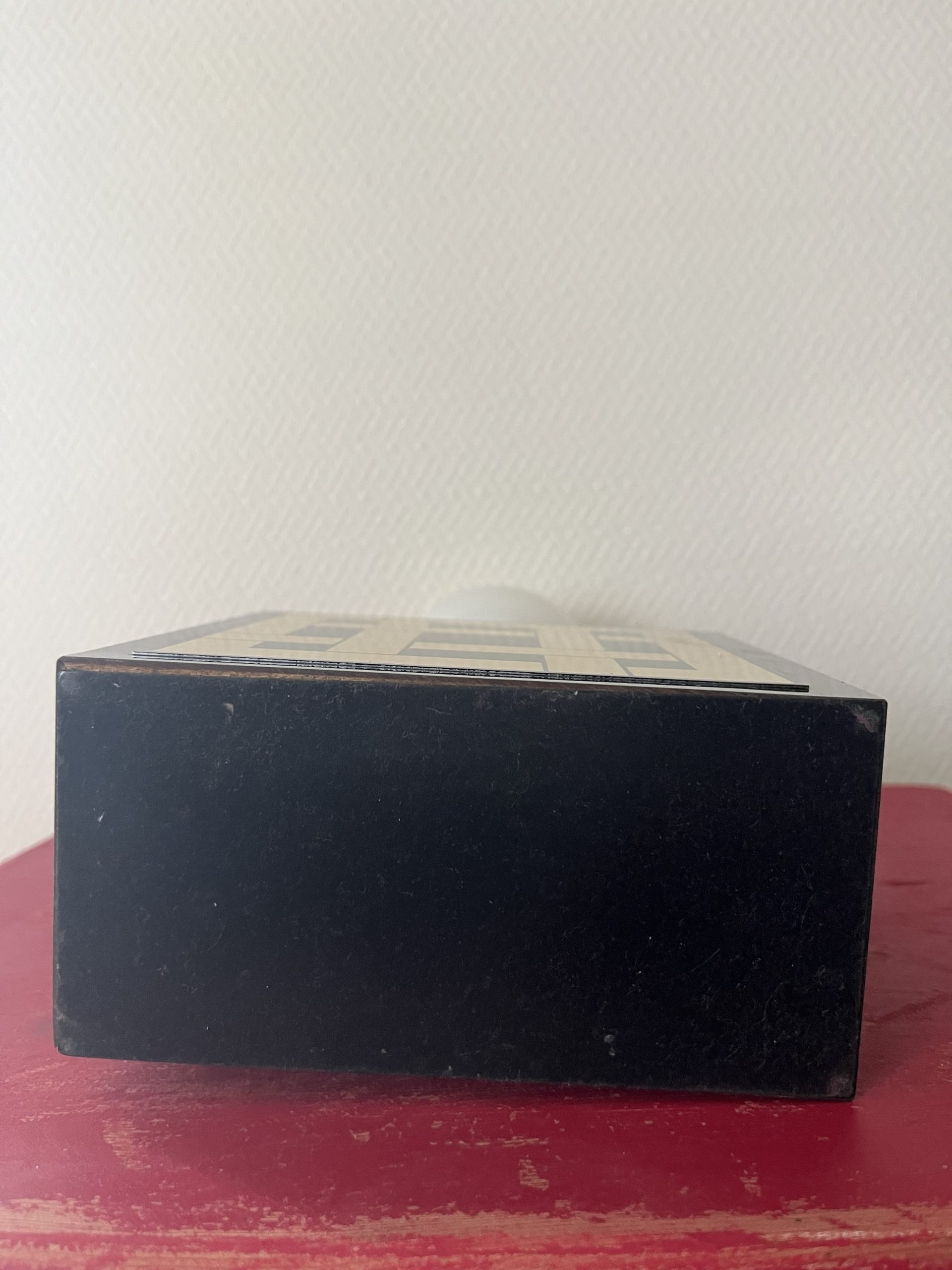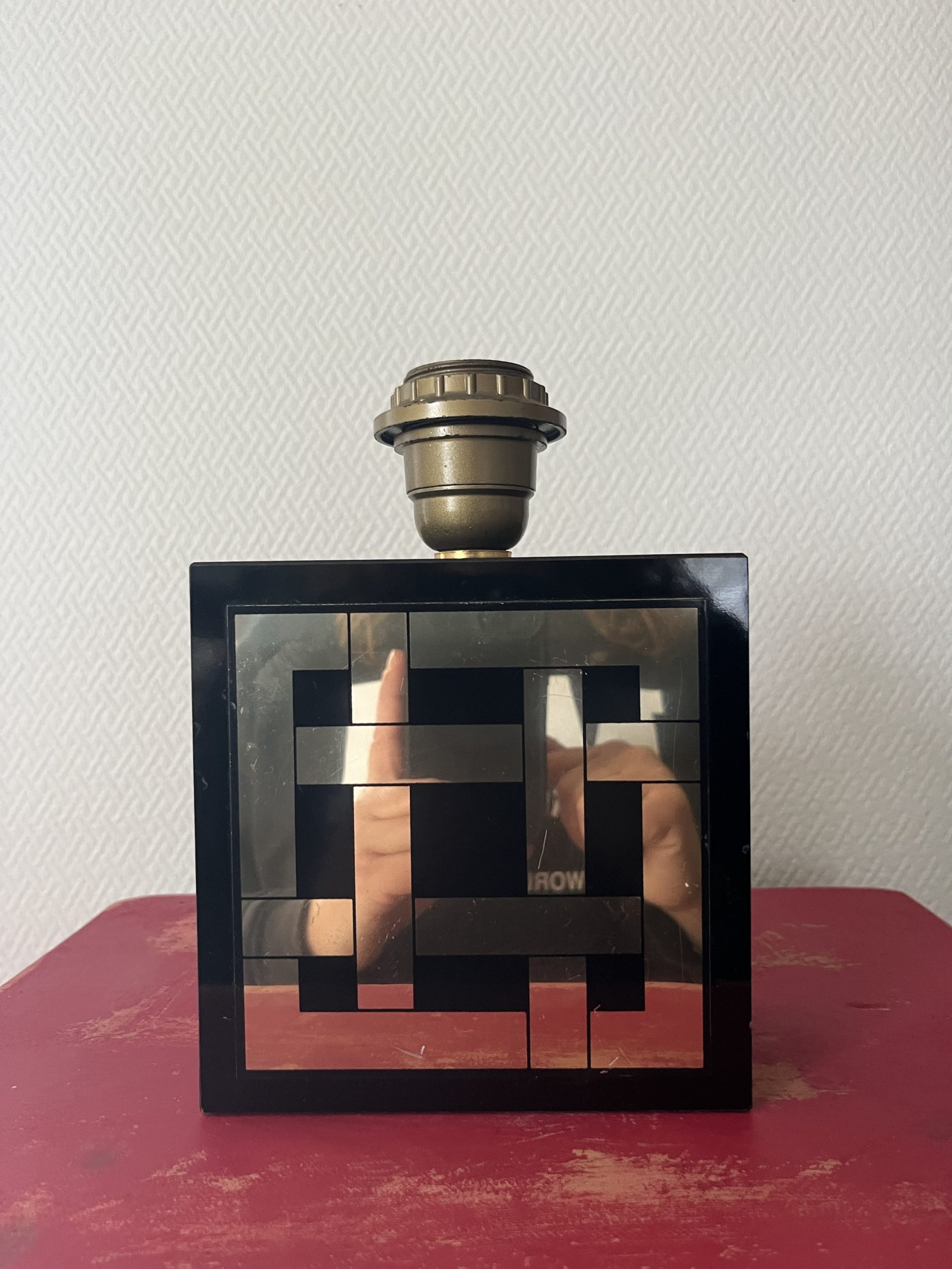 Années 70, Design graphique caractérisé par un pied carré laqué noir orné d’un motif géométrique en laiton doré, son design évoque le style Hollywood Regency et les influences art déco revisitées, très en vogue dans les années 70.