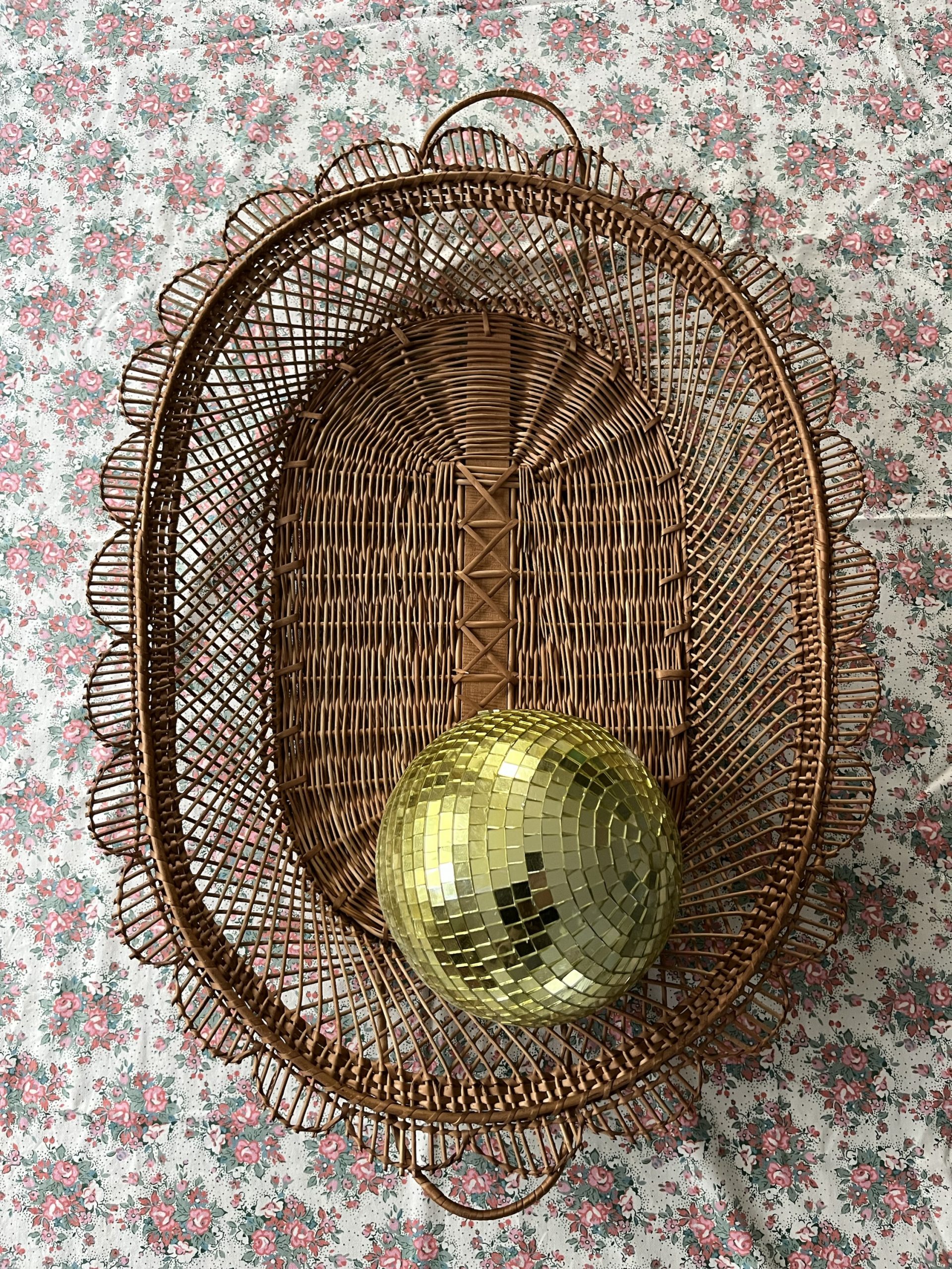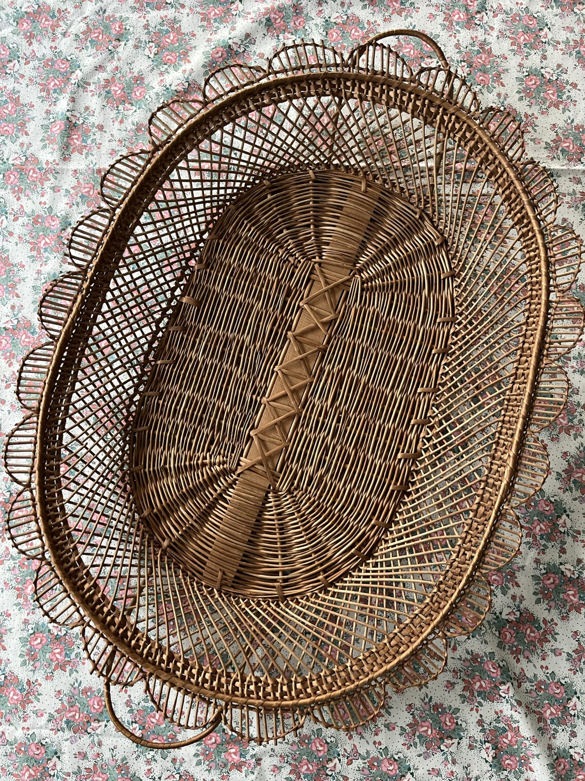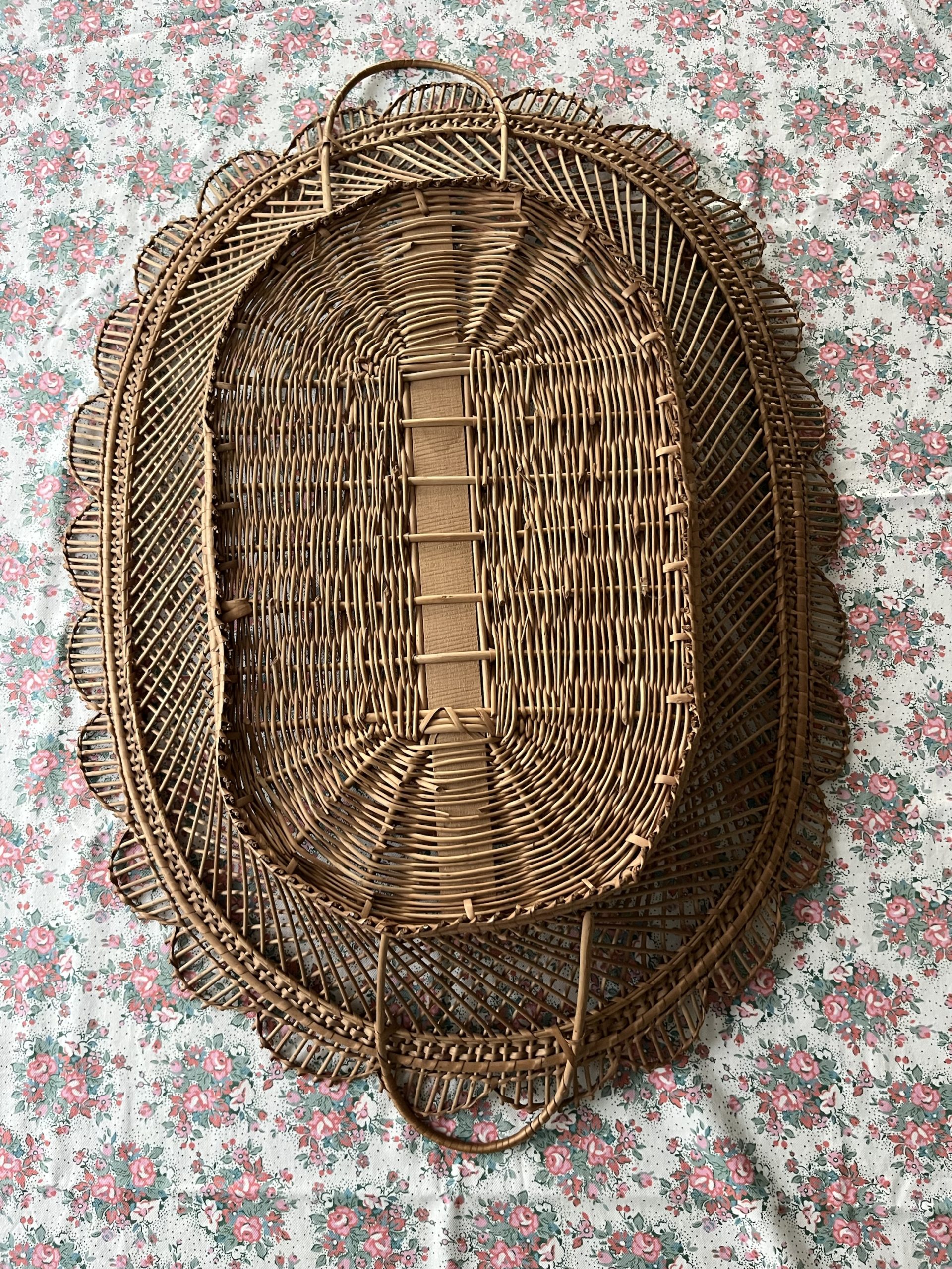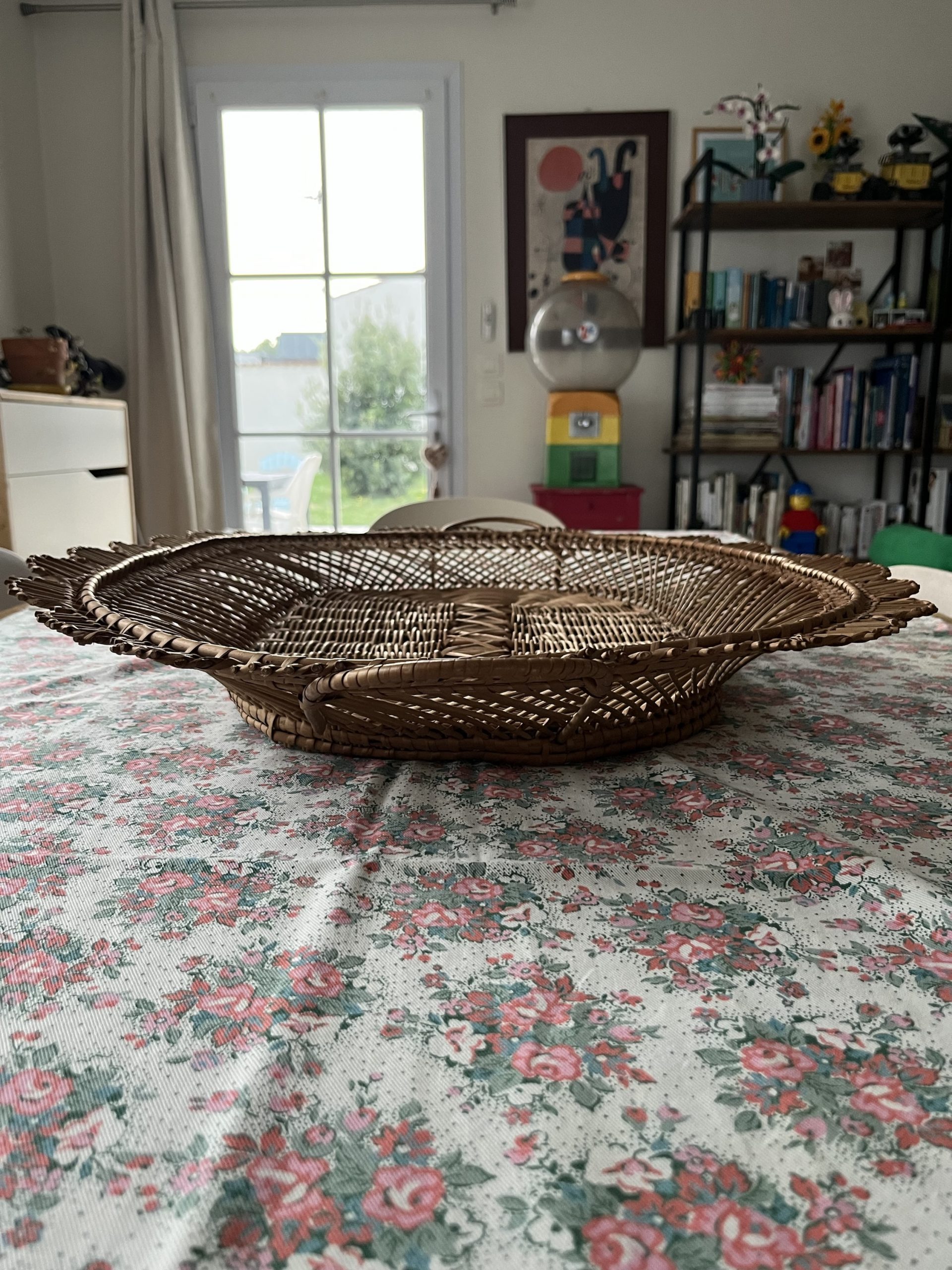 Magnifique panier ou plateau en rotin vintage, beau travail artisanal. Structure robuste et tissage délicat du rotin, vous pourrez l’utiliser aussi bien pour servir que pour organiser de petits objets avec style.