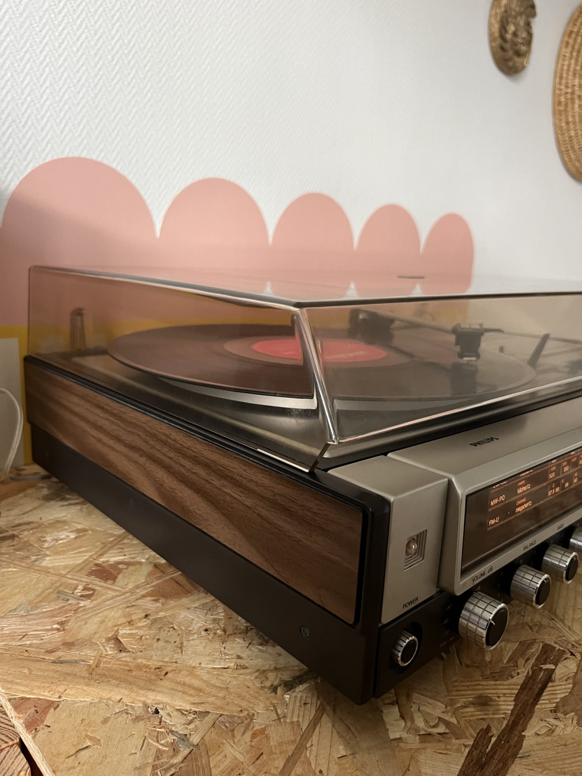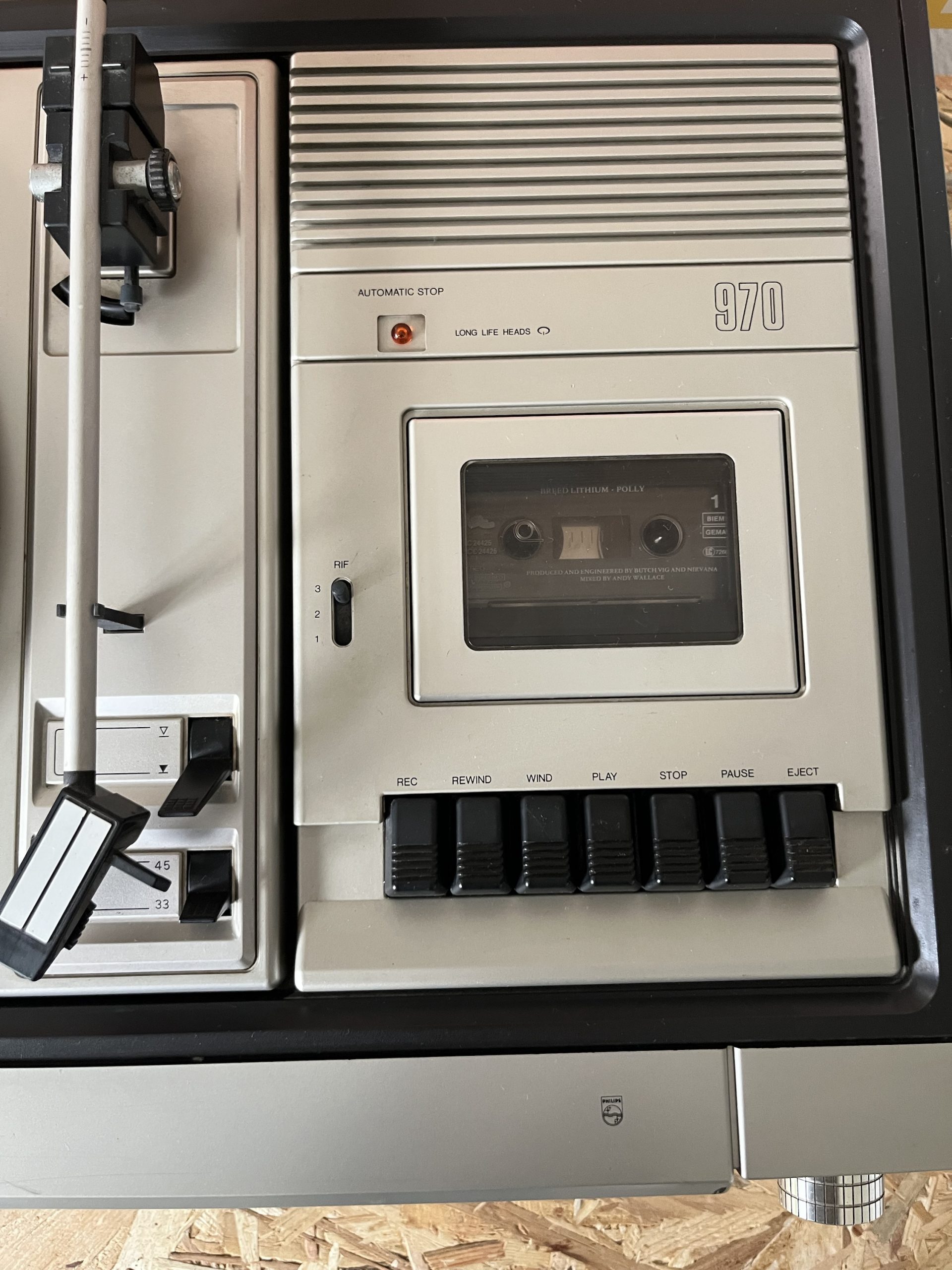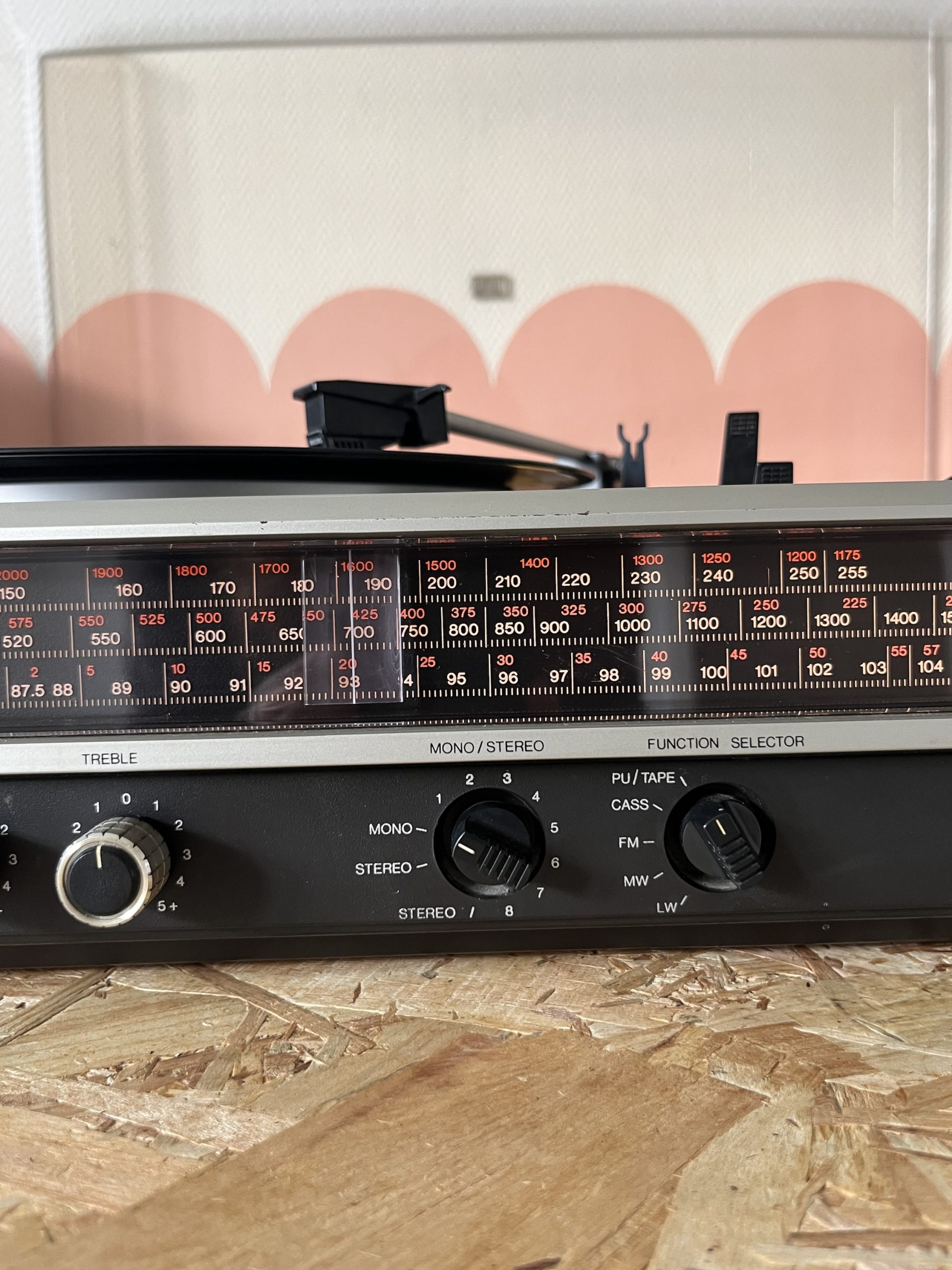 Testée, partie vinyle fonctionne parfaitement ( le diamant a été changé ), radio fonctionne parfaitement(très bonne sensibilité FM, un point fort de Philips à l’époque), partie cassette, le son n’est pas régulier (vague, son monte et descend) à faire réviser par un professionnel.