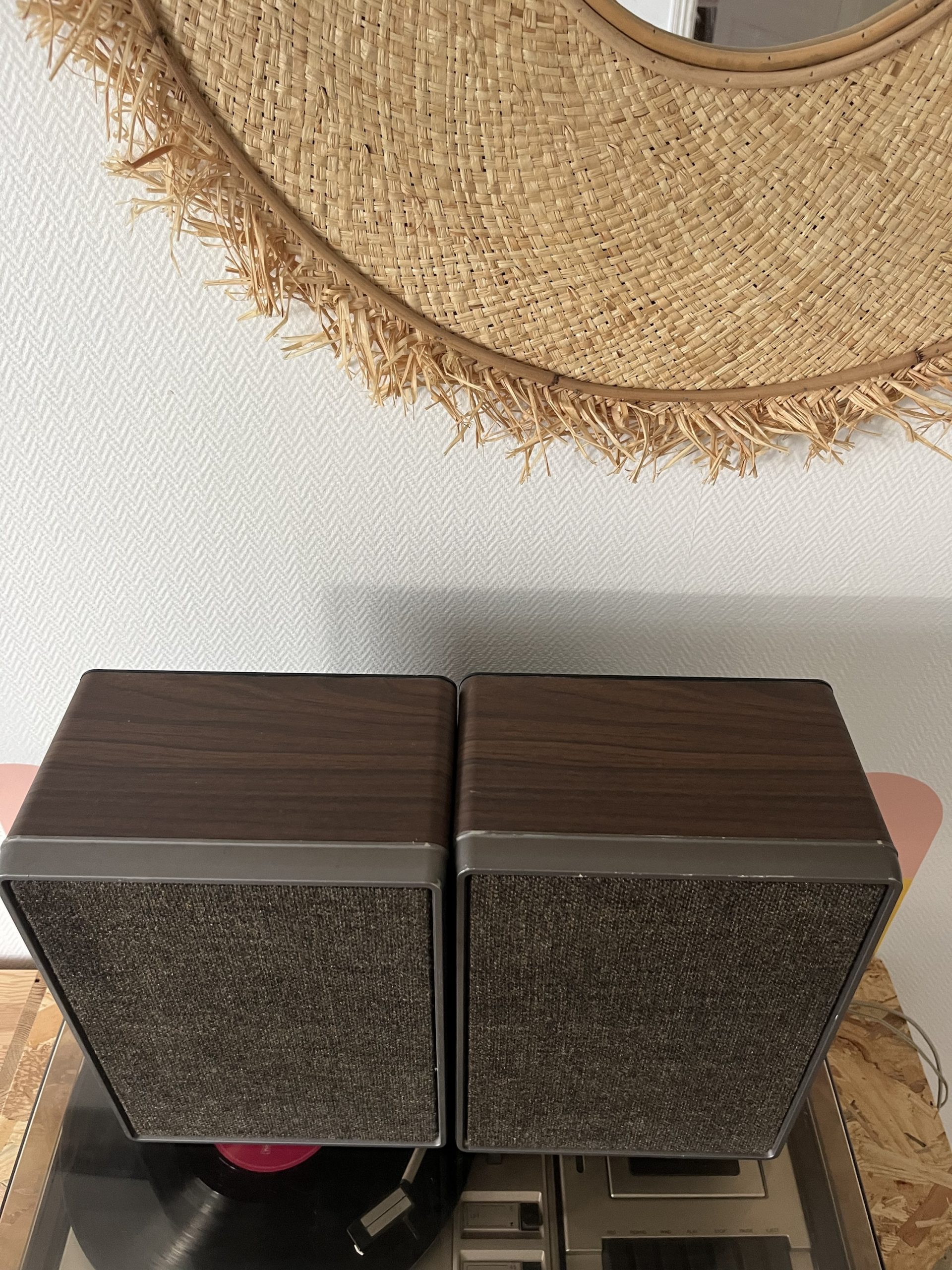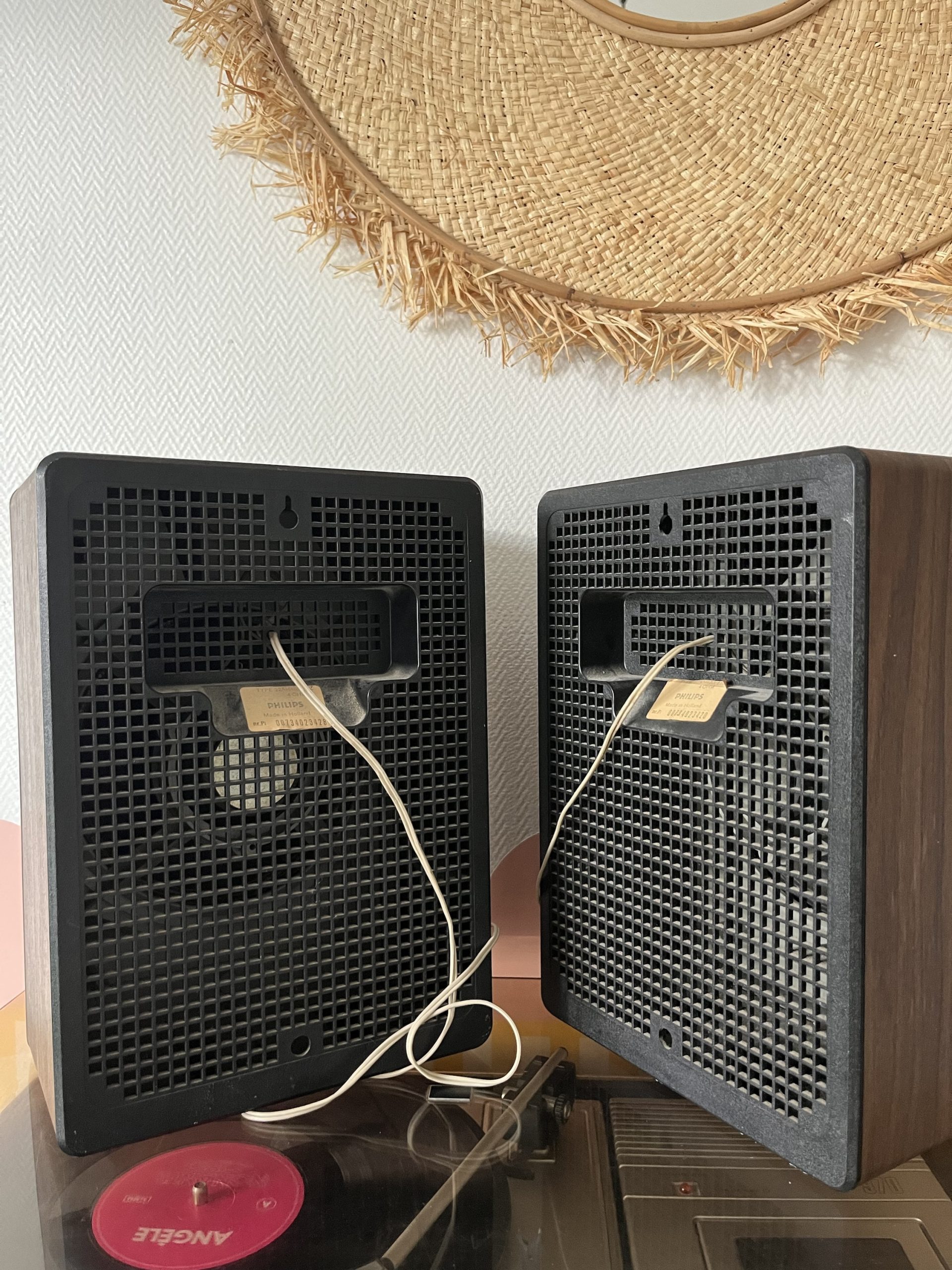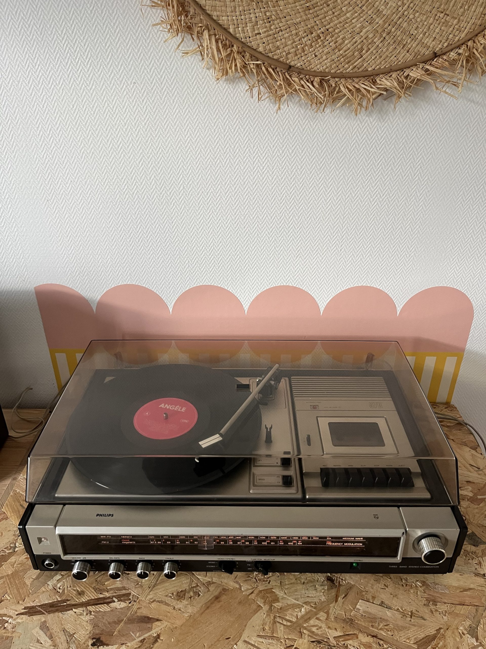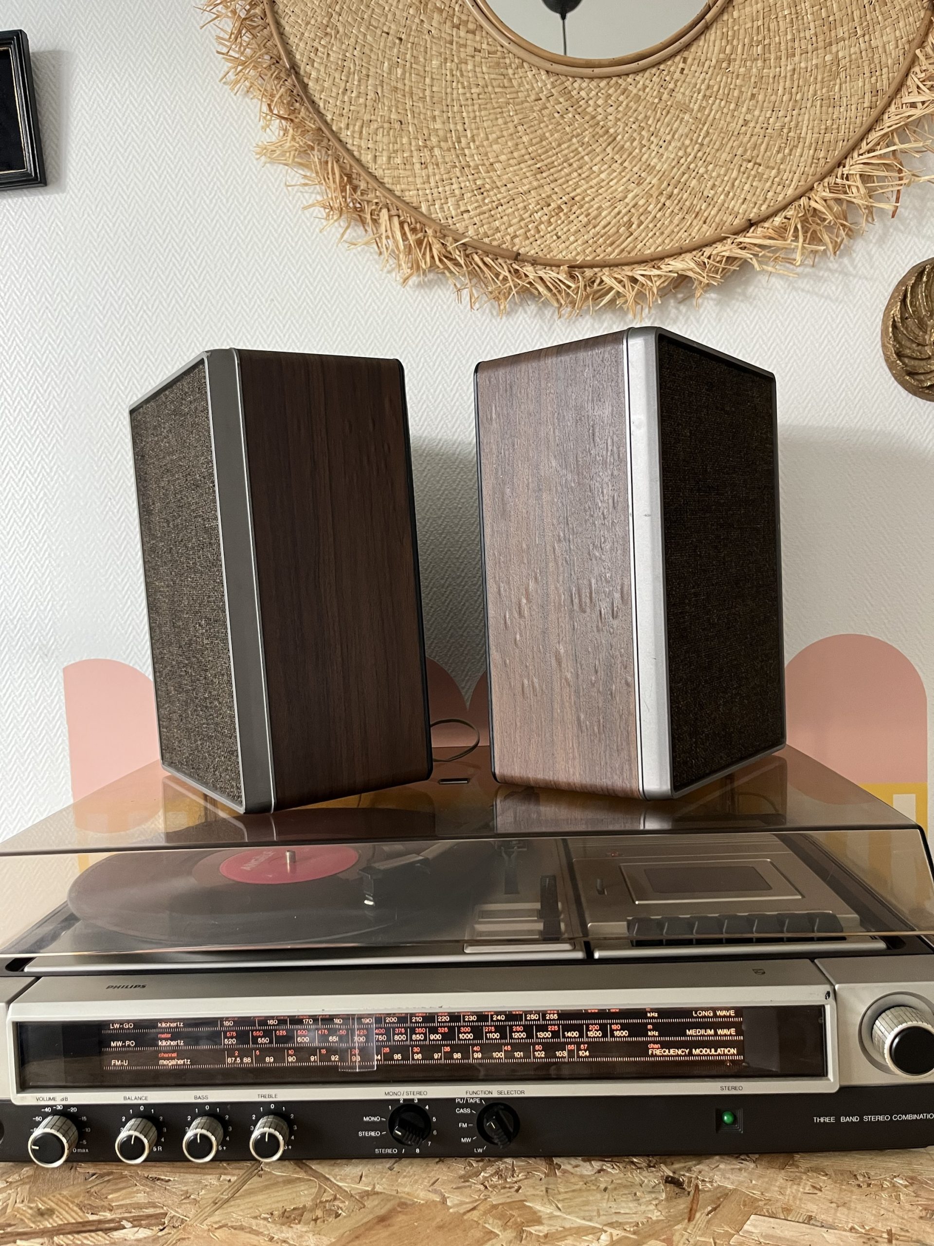 Platine datant des années 70, modèle 970, marque Philips, pour vinyles (33 et 45t), tuner radio AM/FM, Lecteur cassette, amplificateur stéréo intégré, avec deux enceintes d’origine, l’adaptateur pour 45t fourni. Prise classique, à brancher sur secteur.