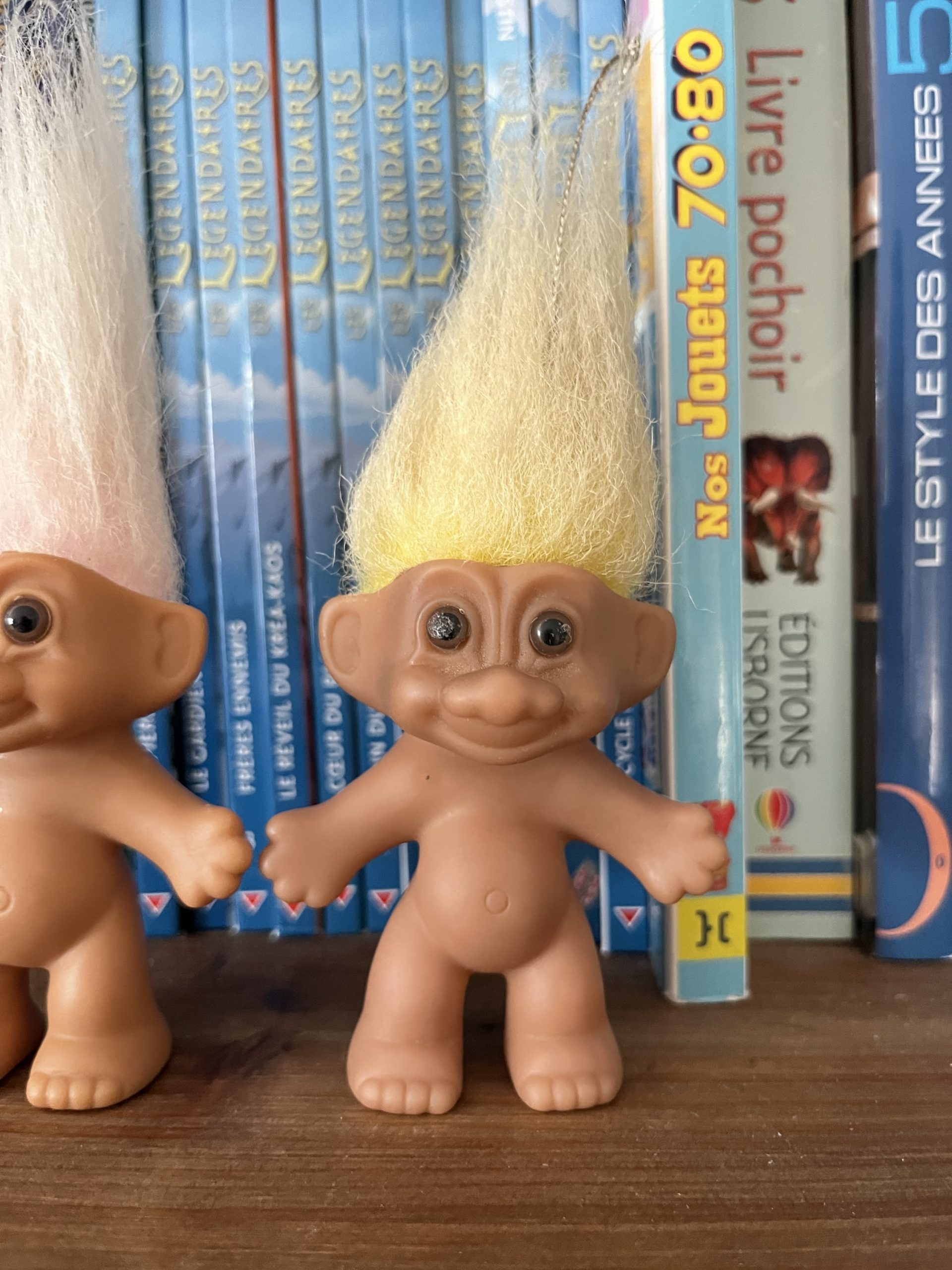 Marque “RUSS”, sous le pied, Troll de collection en bon état, les cheveux son décolorés, une attache pour chacun pour le suspendre.