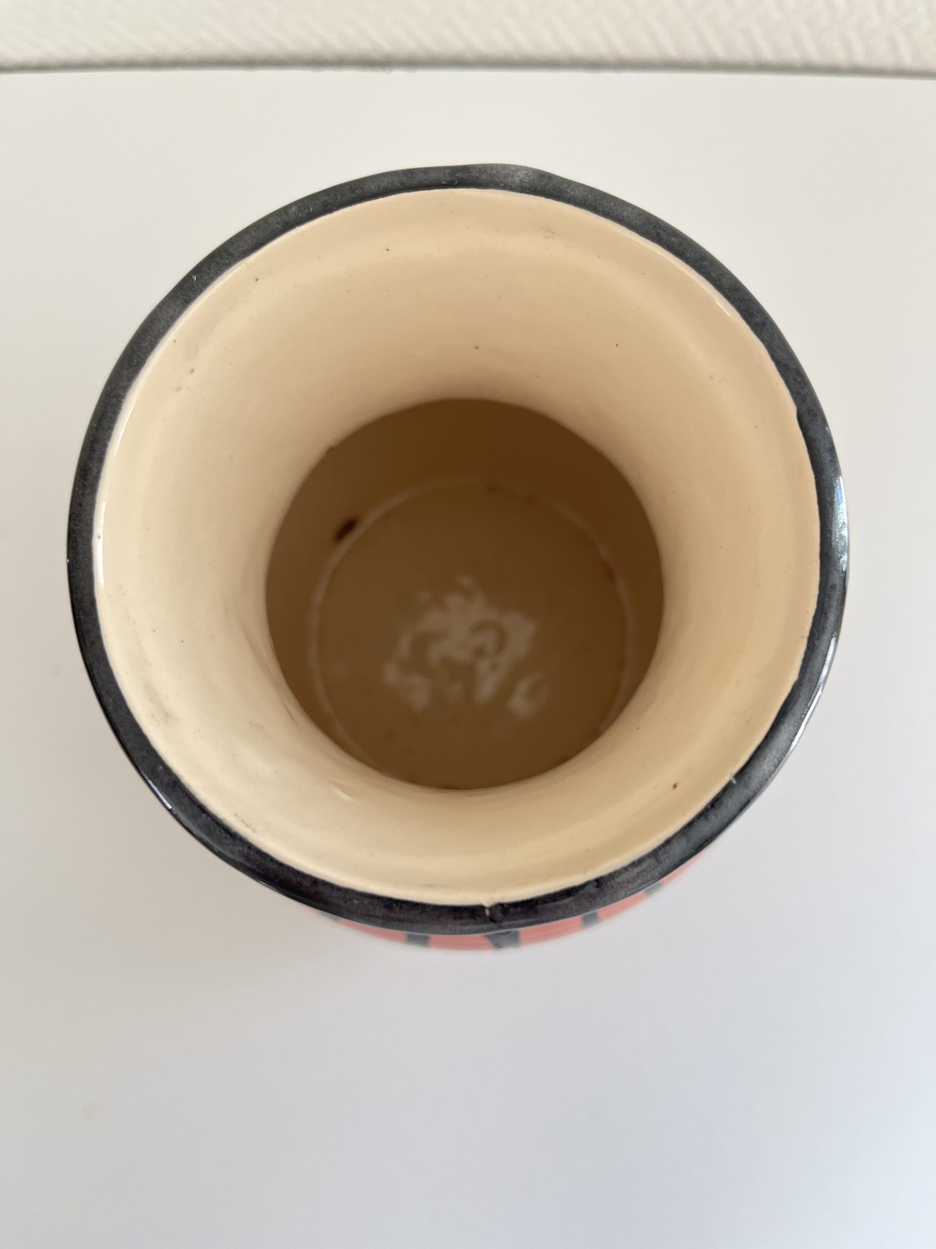 Très joli vase en céramique émaillée vintage, aux jolies rondeurs à grand goulot évasé, style quimper, fabrication artisanale.